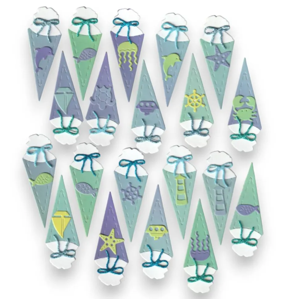 Entdecke das maritime Set für den Schulanfang: Du erhältst 20 liebevoll handgefertigte Mini Schultüten sowie 25 farblich abgestimmte Streuteile. Das Thema ist maritim, gestaltet aus hochwertigem Tonkarton und glitzerndem Moosgummi – ideal für deine festliche Dekoration oder kreative Projekte.