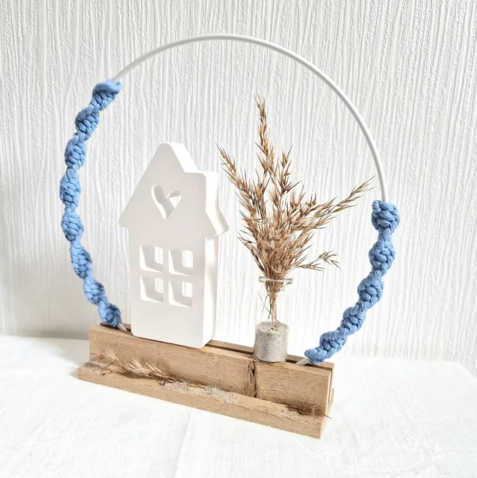 Dieser Ring ist eine harmonische Kombination aus Makramee, Holzklötzchen, Metall, niedlichen Häuschen aus Raisin und Pampasgras.