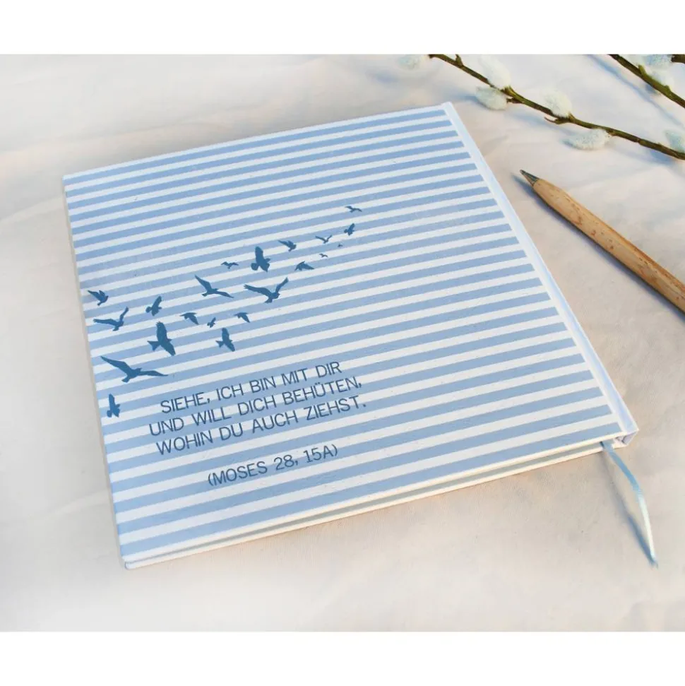 Liebevoll gestaltetes Gästebuch zur Taufe im nordischen Vintage-Design mit Anker, Tau, Möwen und Streifen in maritimen Blautönen, dass durch die Wünsche deiner Gäste zu einem einzigartigen Erinnerungsstück wird. Das Taufalbum mit ozeanischen Elementen in mattem Blau bietet reichlich Platz für Eintragungen, Fotos und eigene Gedanken.