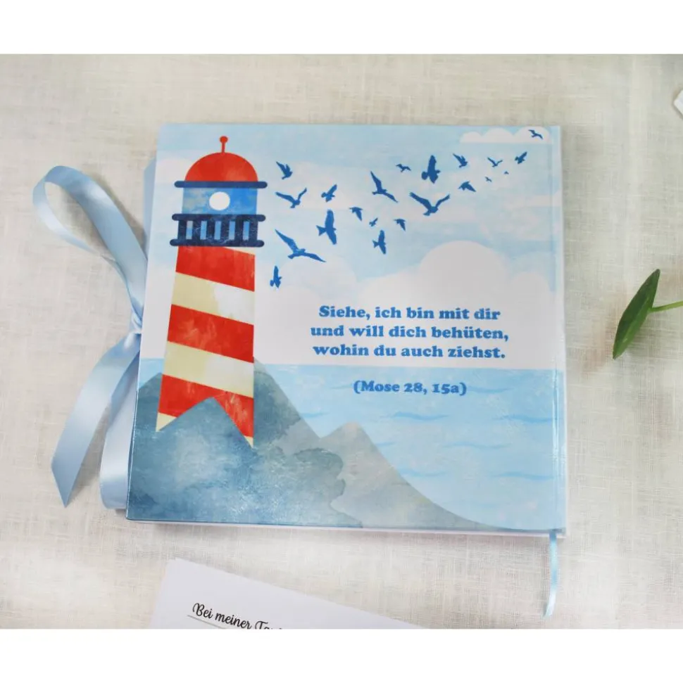 Liebevoll gestaltetes Gästebuch zur Taufe im nordischen Vintage-Design mit Segelboot, Tau, Möwen und Leuchtturm in dunklem Marineblau und Rot, dass durch die Wünsche deiner Gäste zu einem einzigartigen Erinnerungsstück wird. Das Taufalbum mit ozeanischen Elementen in Dunkelblau bietet reichlich Platz für Eintragungen, Fotos und eigene Gedanken.