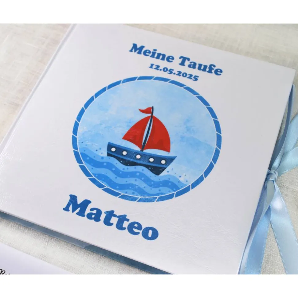 maritimes Gästebuch & Album zur Taufe mit Segelboot in Tot & Blau auf dem Meer; blanko o. Fragen