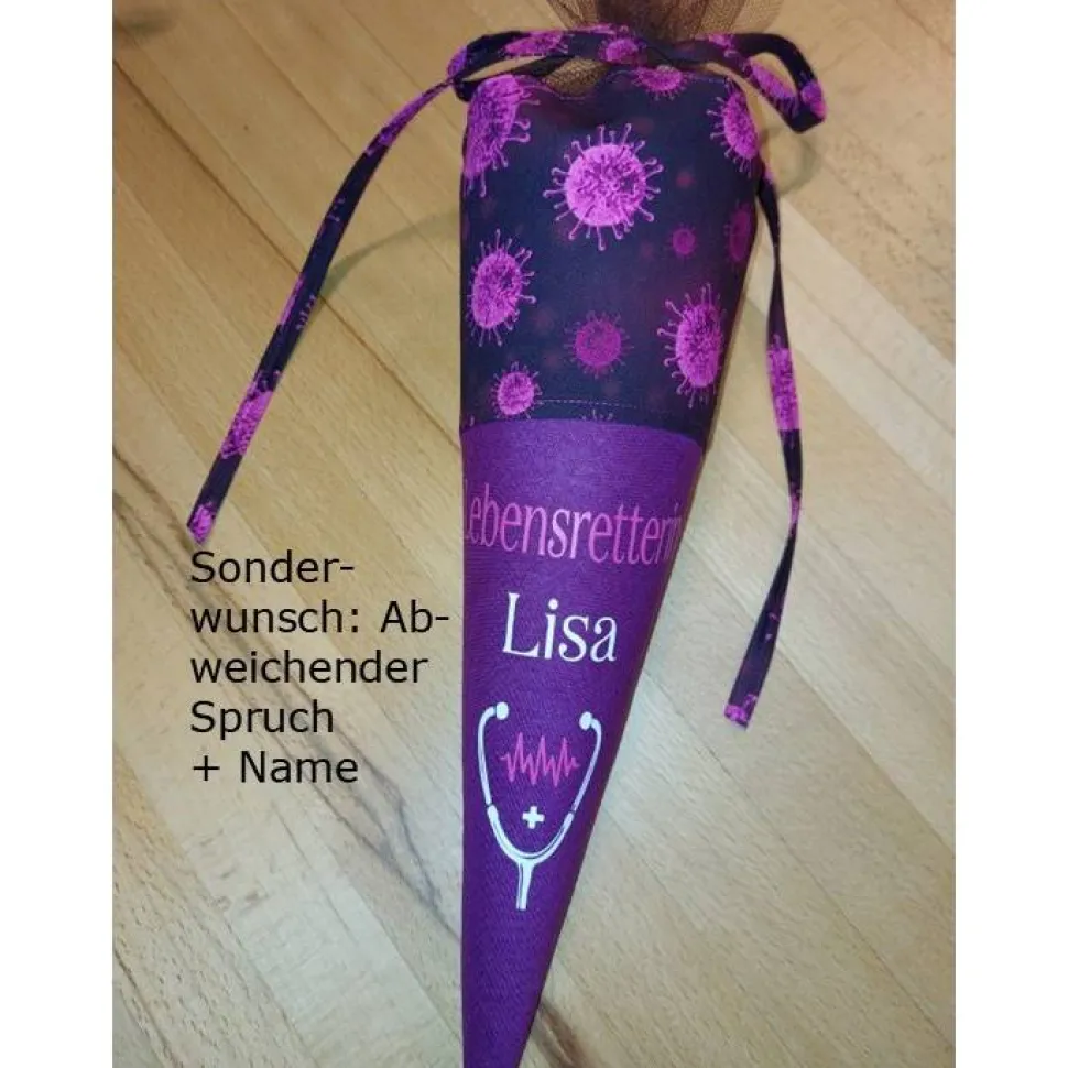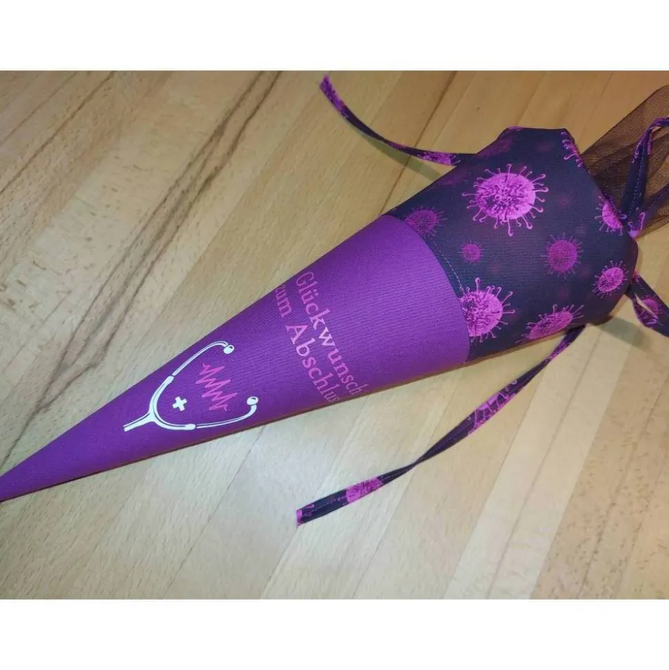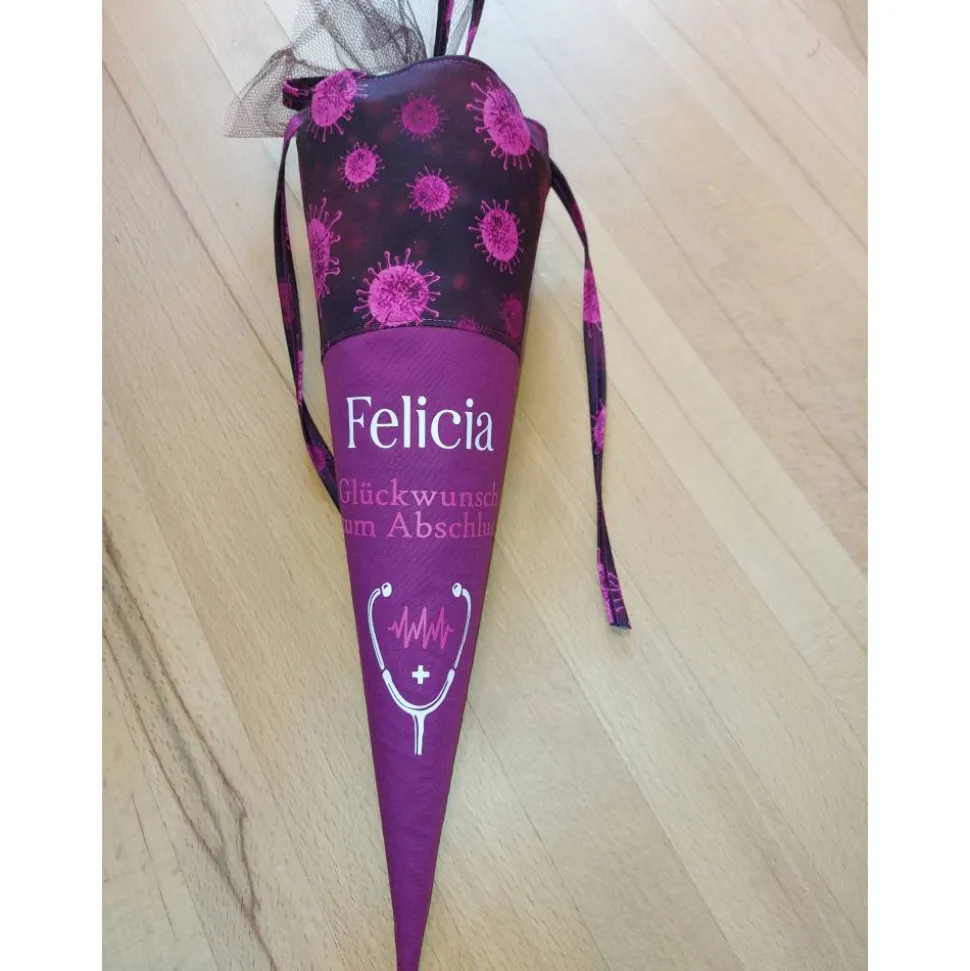 ➡ Standardmäßig wird die Schultüte folgendes angebracht: * Spruch „Glückwunsch zum Abschluss“ (sollte der Spruch gewünscht sein, bitte kurze Info bei Abschluss der Bestellung oder zeitnah per Nachricht)* Motiv eines Stethoskops (Motiv des Stethoskops ist KI-generiert angelehnt)* optional: Wunschtext