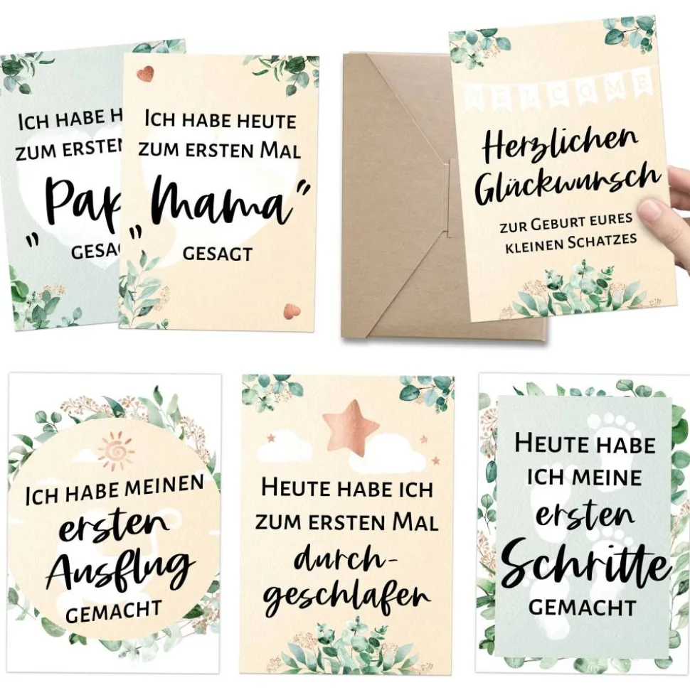 Die Motive der Meilensteinkarten in Eucalyptus- / Greenery-Optik: