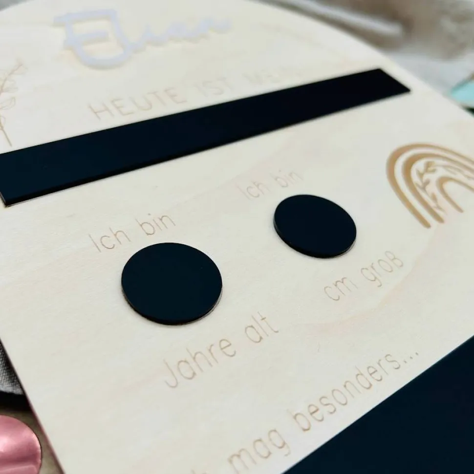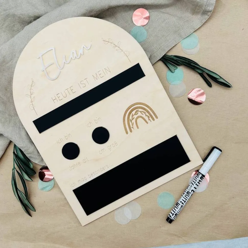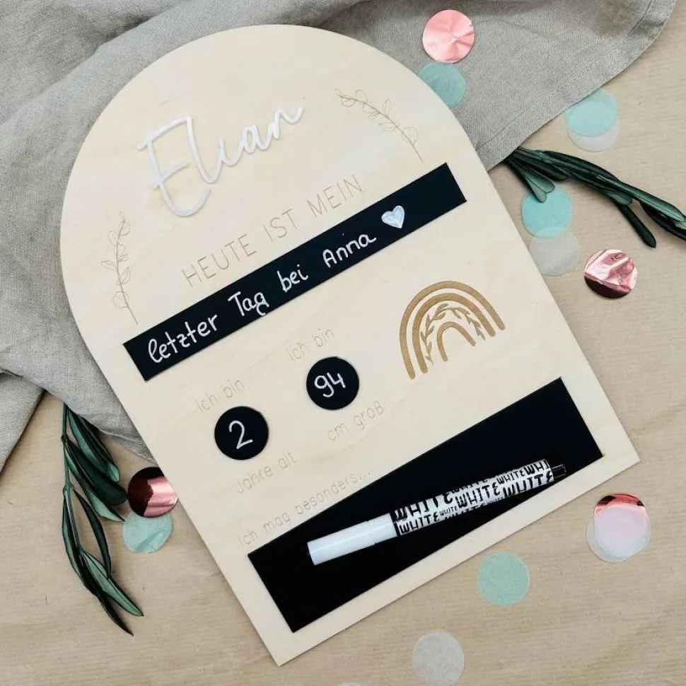 Mithilfe eines non permanenten Kreidestifts, auf Wunsch bei uns ebenfalls erhältlich, könnt ihr auf den schwarzen Täfelchen (mattes Acryl) das Ereignis, das Datum, die aktuelle Größe und das Alter eures Kindes, sowie die gegenwärtigen Vorlieben eures Schatzes festhalten und mittels eines Fotos gemeinsam mit eurem Kind verewigen.