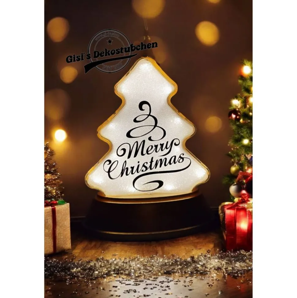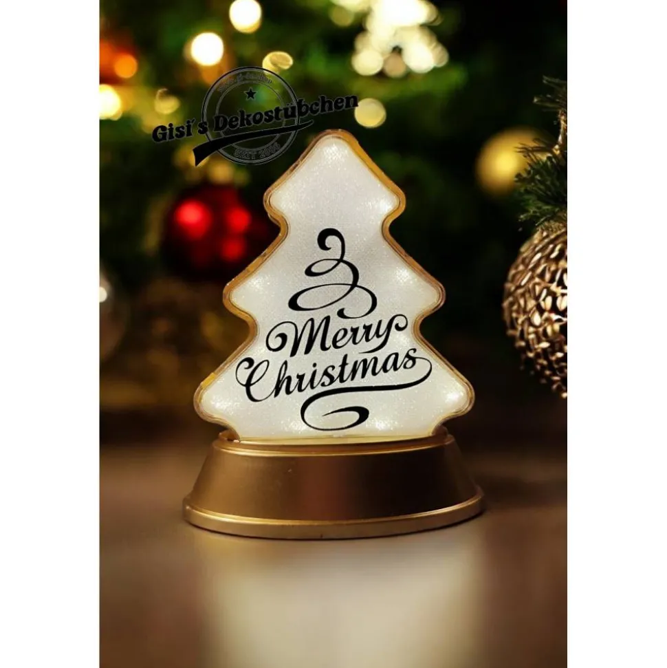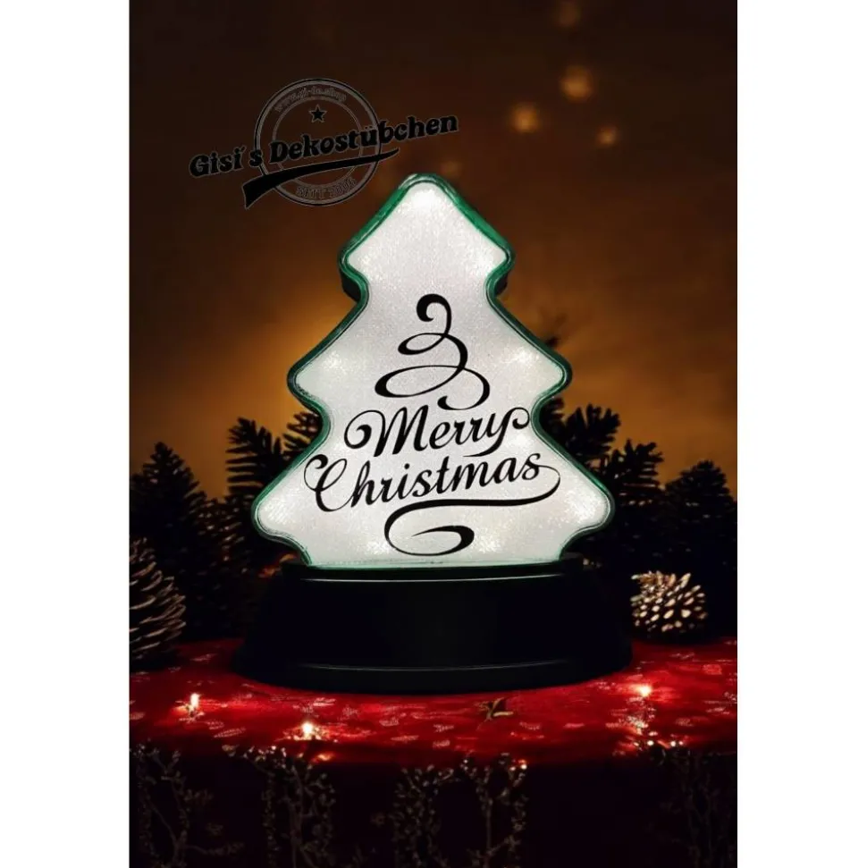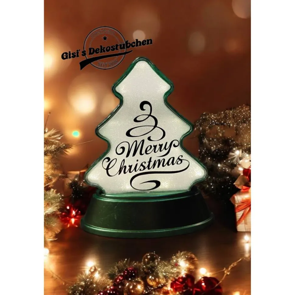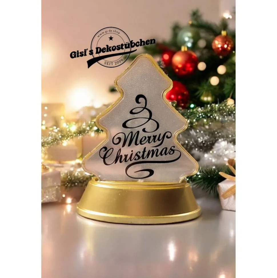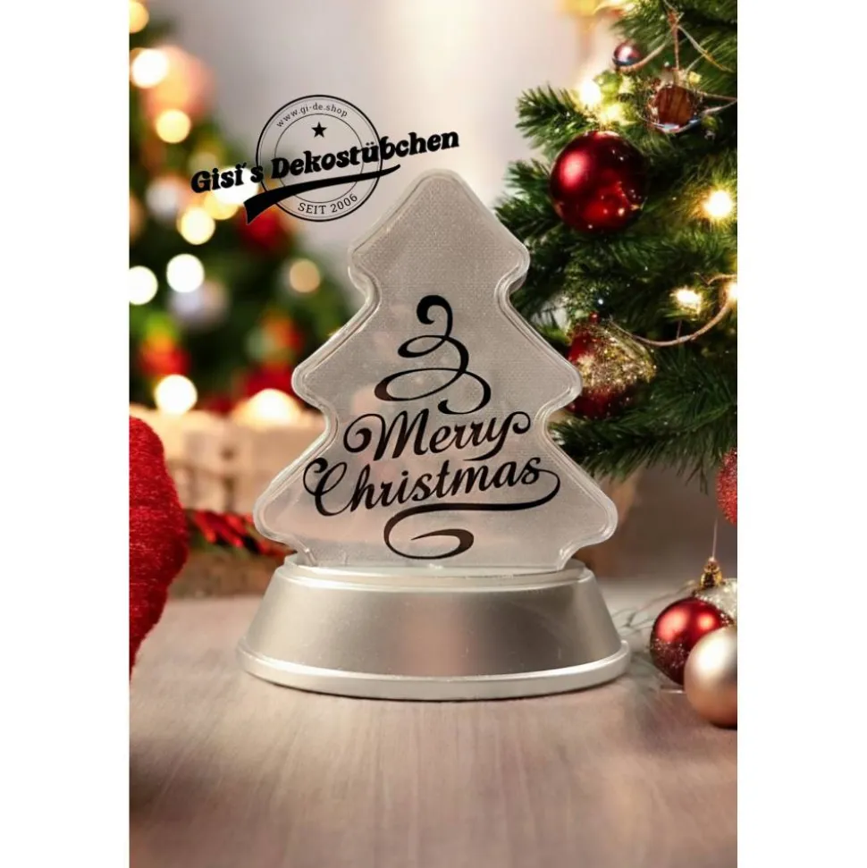 Hier bekommt ihr eine schöne Relaxleuchte in Tannenbaum Form mit Merry Christmas aufdruck in eurer Wunsch Farbe.