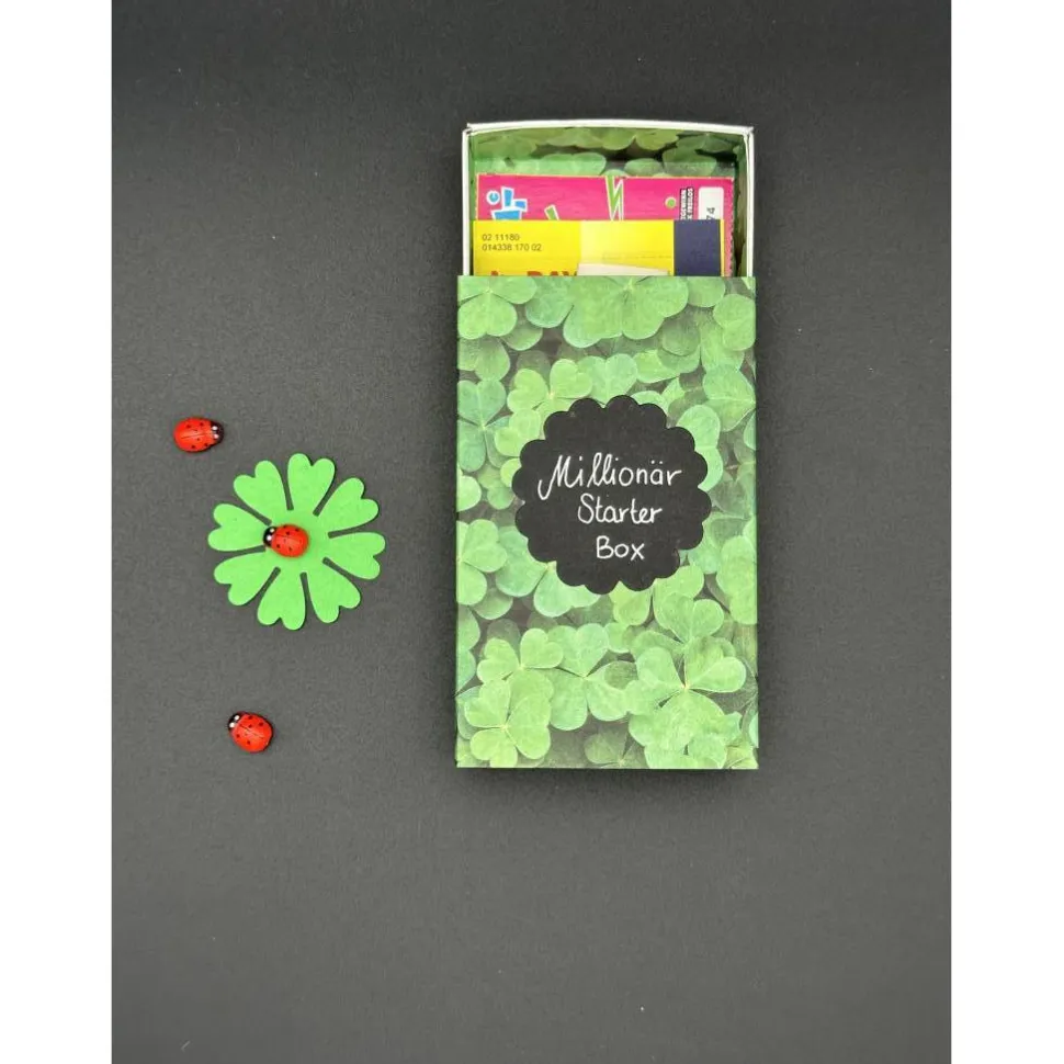 Als besonderes Highlight ist ein kleiner Holz-Marienkäfer auf der Lasche aufgeklebt – ein echter Glücksbringer! Auch das Außenteil der Box ist mit dem Klee-Motiv verziert und trägt einen schwarzen Aufkleber mit weißer Aufschrift: „Millionär Starter Box“.