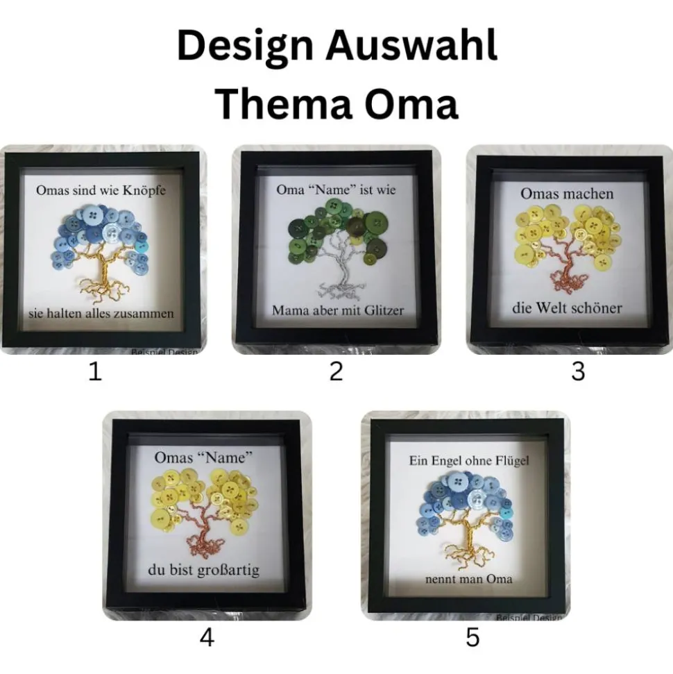 Sie können sich Ihren Knopfbaum ganz nach Ihren Wünschen anfertigen lassen. Da ich jeden Knopfbaum von Hand fertige kann ich solche Wunsch berücksichtigen. Die Bilder zeigen Ihnen wie der Knopfbaum ungefähr aussehen würde. Da jeder Knopfbaum ganz individuell gefertigt wird, sieht jeder anders aus. Für den Knopfbaum verwende ich fast 3 Meter Draht und zwischen 20 und 30 Knöpfen. Den ich von Hand mit speziellen Techniken biege und drahte. Um dieses Design zu fertigen. Sobald der Knopfbaum fertig ist wird dieser von mir in den 3D Bilderrahmen eingesetzt. Diesen können sie dann hinstellen oder anhängen.