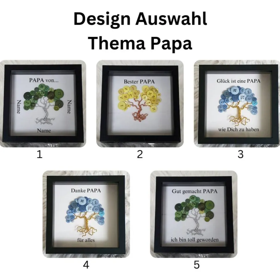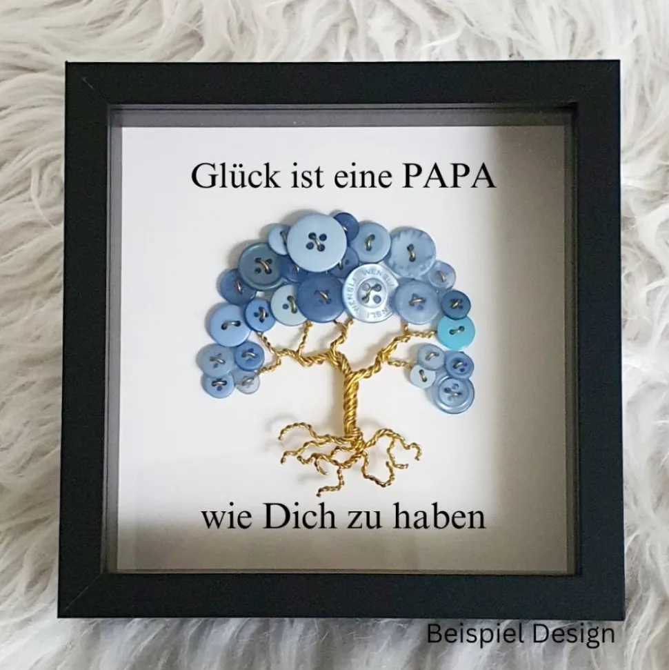 Sie können sich Ihren Knopfbaum ganz nach Ihren Wünschen anfertigen lassen. Da ich jeden Knopfbaum von Hand fertige kann ich solche Wunsch berücksichtigen. Die Bilder zeigen Ihnen wie der Knopfbaum ungefähr aussehen würde. Da jeder Knopfbaum ganz individuell gefertigt wird, sieht jeder anders aus. Für den Knopfbaum verwende ich fast 3 Meter Draht und zwischen 20 und 30 Knöpfen. Den ich von Hand mit speziellen Techniken biege und drahte. Um dieses Design zu fertigen. Sobald der Knopfbaum fertig ist wird dieser von mir in den 3D Bilderrahmen eingesetzt. Diesen können sie dann hinstellen oder anhängen.