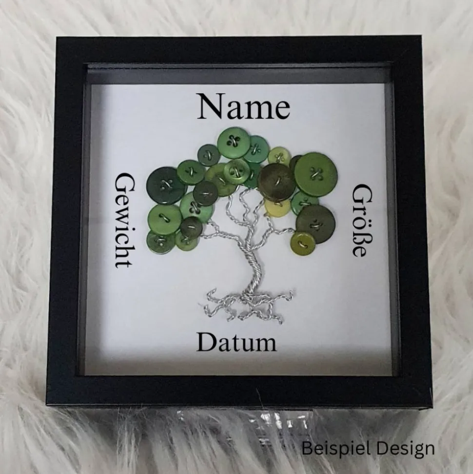 Sie können sich Ihren Knopfbaum ganz nach Ihren Wünschen anfertigen lassen. Da ich jeden Knopfbaum von Hand fertige kann ich solche Wunsch berücksichtigen. Die Bilder zeigen Ihnen wie der Knopfbaum ungefähr aussehen würde. Da jeder Knopfbaum ganz individuell gefertigt wird, sieht jeder anders aus. Für den Knopfbaum verwende ich fast 3 Meter Draht und zwischen 20 und 30 Knöpfen. Den ich von Hand mit speziellen Techniken biege und drahte. Um dieses Design zu fertigen. Sobald der Knopfbaum fertig ist wird dieser von mir in den 3D Bilderrahmen eingesetzt. Diesen können sie dann hinstellen oder anhängen.