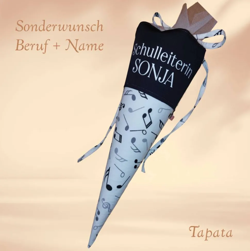 ➡ Namenswunsch: Auf Wunsch kann die Schultüte mit dem Namen oder einen Titel (z.B. Musiklehrer) versehen werden. Bitte geben Sie in das Feld Personalisierungswünsche den Wunschtext ein. Max. 20 Zeichen. Je nach Länge wird die Schriftgröße angepasst.