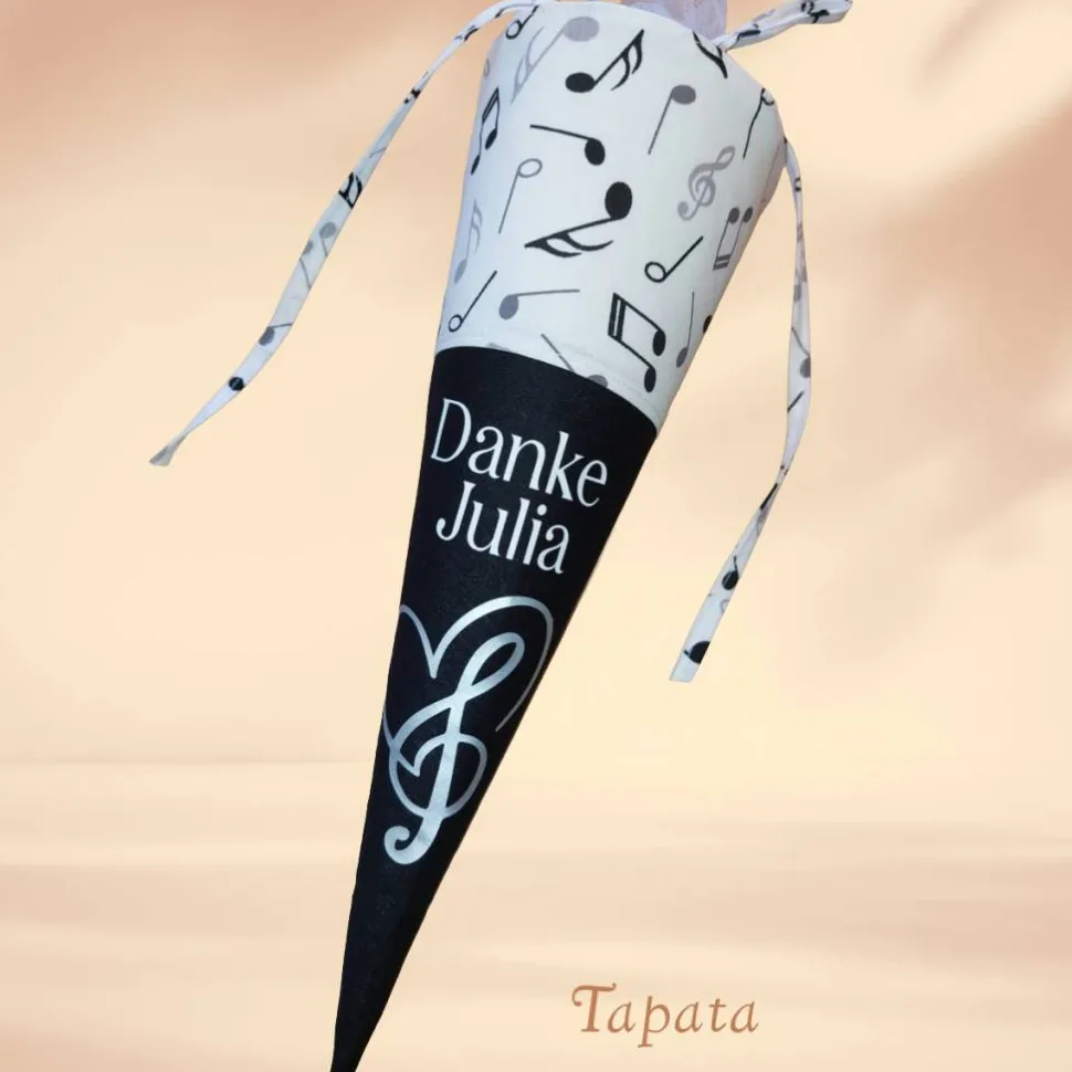 Angeboten wird eine Schultüte mit einem passenden Spruch (Sei es ein eine musikalische Prüfung, Start in die Musikschule oder Musikstudium).