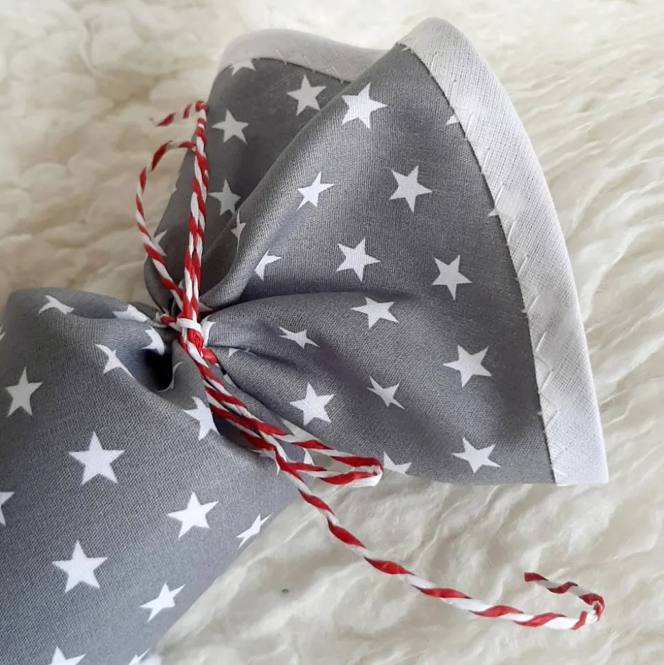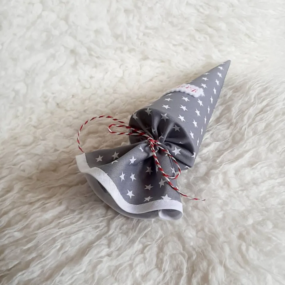 Die kleine Tüte ist von mir aus einem dunkel-grauen Baumwollstoff mit kleinen weißen Sternen genäht und mit einem Filzaufnäher und einem weißen Schrägband verziert.