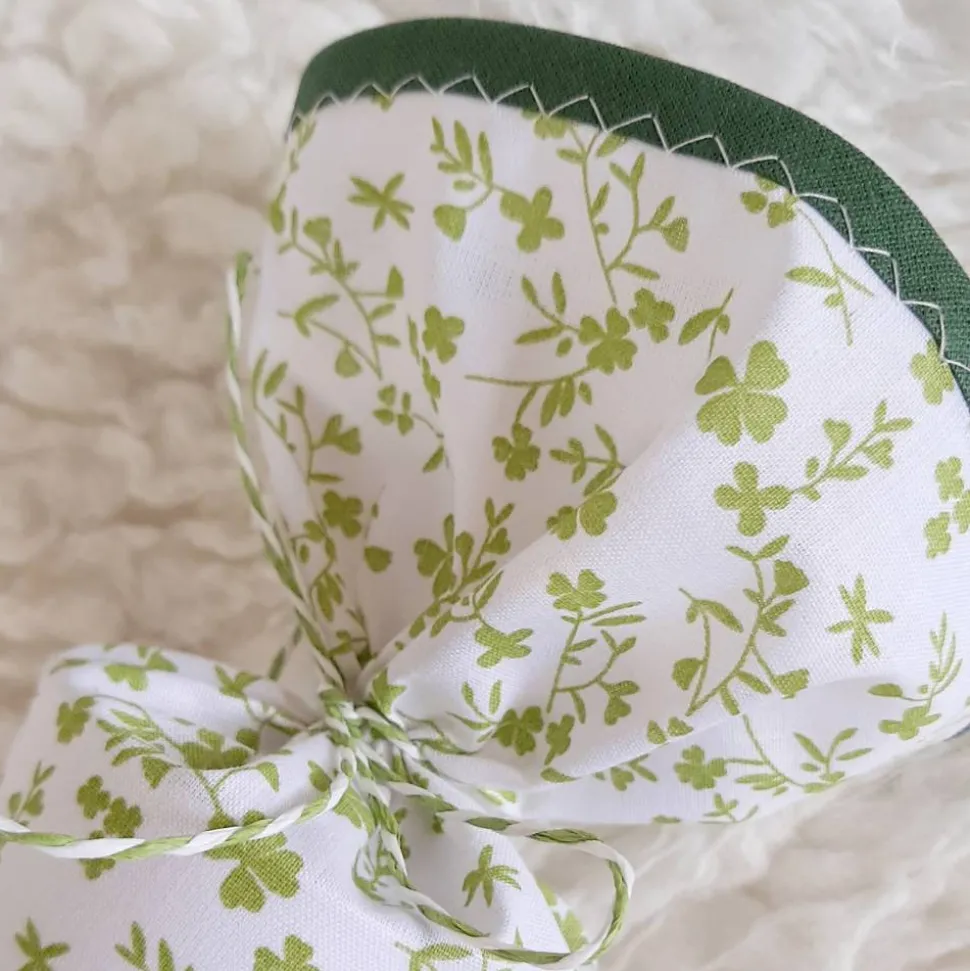 Die kleine Tüte ist von mir aus einem weißen Baumwollstoff mit kleinen grünen Kleeblättern genäht und mit einem Filzaufnäher und einem grünen Schrägband verziert.
