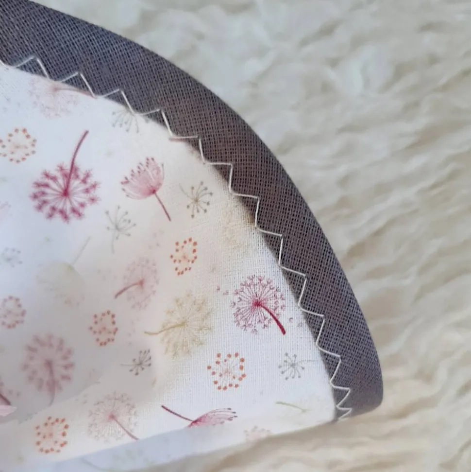 Die kleine Tüte ist von mir aus einem weißen Baumwollstoff mit bunten Pusteblumen genäht und mit einem Filz-Aufnäher und einem grauen Schrägband verziert.