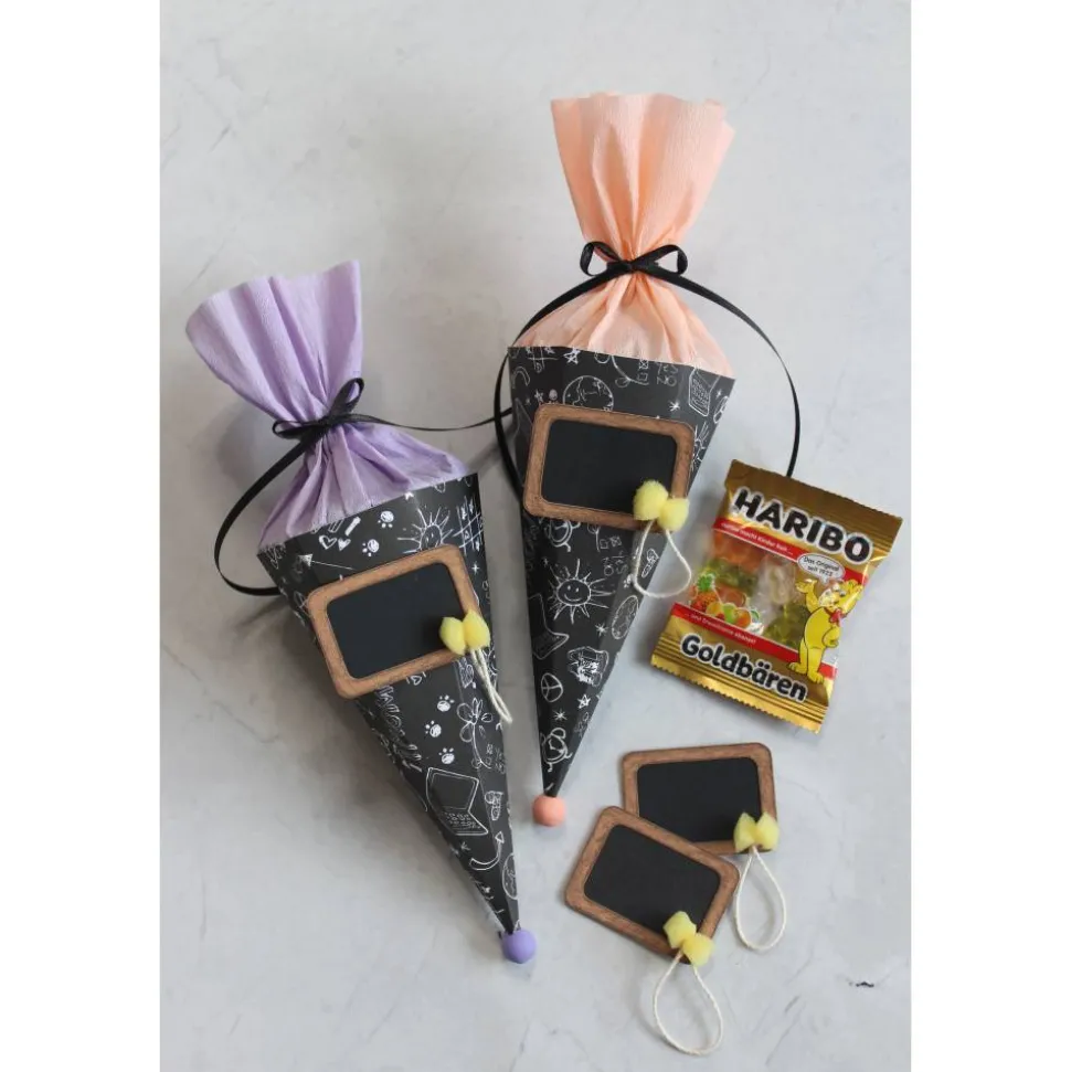 Je nach Bestand können kleine Details wie Schleifenband, Krepppapier usw. in Art und Farbe variieren, aber immer passend zur Mini-Schultüte.
