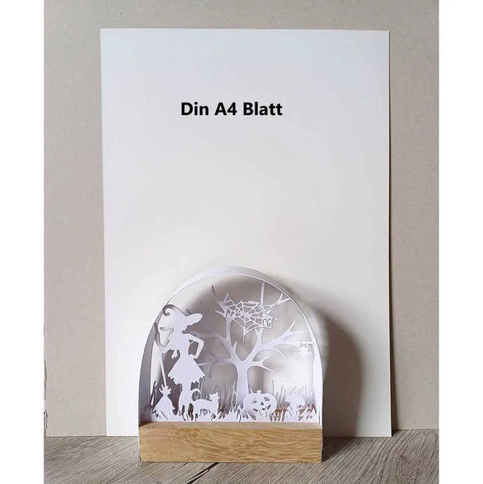 Material: Gefertigt aus 4 Klötzchen Eiche und detailreichen Stanzteilen aus Aquarellpapier (300g/m²), die per Hand ausgeschnitten und liebevoll mit Holzleim befestigt wurden. Dadurch entsteht ein faszinierender 3D-Effekt.