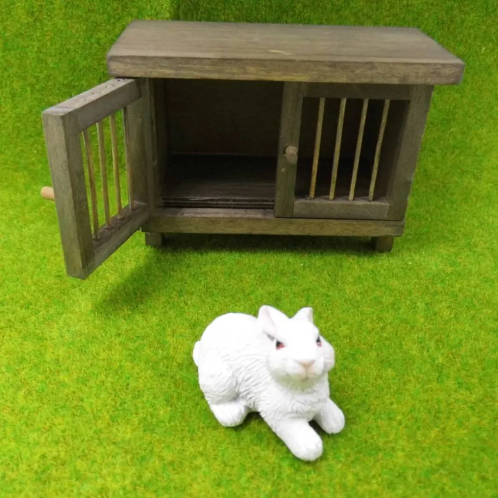 Das Set enthält einen Hasenstall, der sich öffnen lässt (Maße: 10 x 5 x 7 cm) und einen Hasen in weiß oder braun. Der weiße Hase misst 4,5 x 3 cm, der braune Hase 4 x 3 cm. Perfekt geeignet zum kreativen Gestalten und Dekorieren deiner Miniaturwelt.