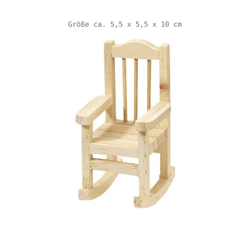 Ob als gemütlicher Sitzplatz im Wichtelhaus, als nostalgische Note im Puppenzimmer oder als dekoratives Element in einer Winterlandschaft – dieser kleine Schaukelstuhl eröffnet unendlich viele kreative Möglichkeiten. Das unbehandelte Holz lässt sich wunderbar bemalen, lasieren oder mit Stoffen und Accessoires dekorieren, sodass du ihn ganz nach deinem persönlichen Stil gestalten kannst.