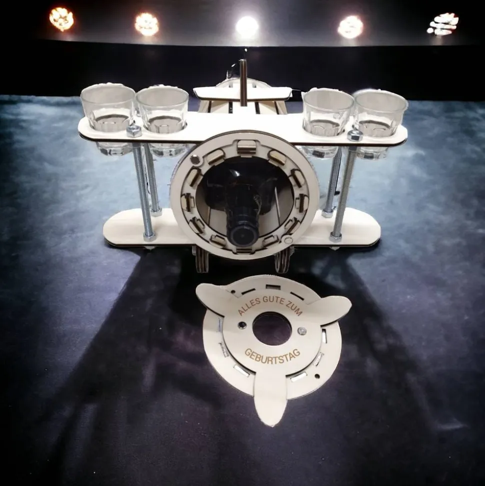 Unser handgefertigtes Flaschenflugzeug, auch bekannt als Löschflugzeug, kombiniert Kunstfertigkeit mit Funktionalität und wird garantiert zum Blickfang auf jeder Feier. Es eignet sich ideal als originelles Geschenk für Geburtstage, Hochzeiten oder Weihnachten und ist ein Highlight für jede Bar.
