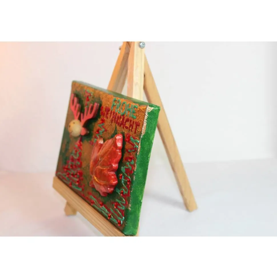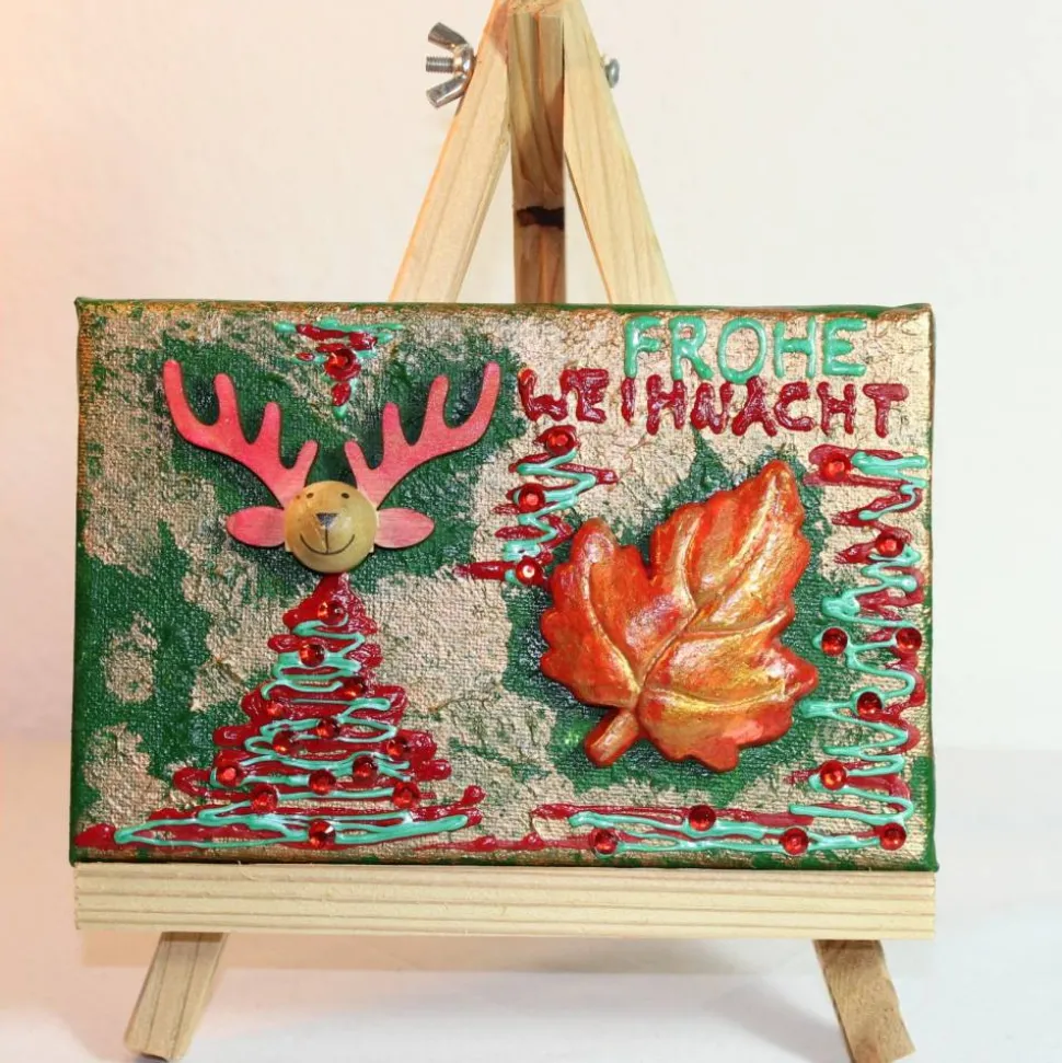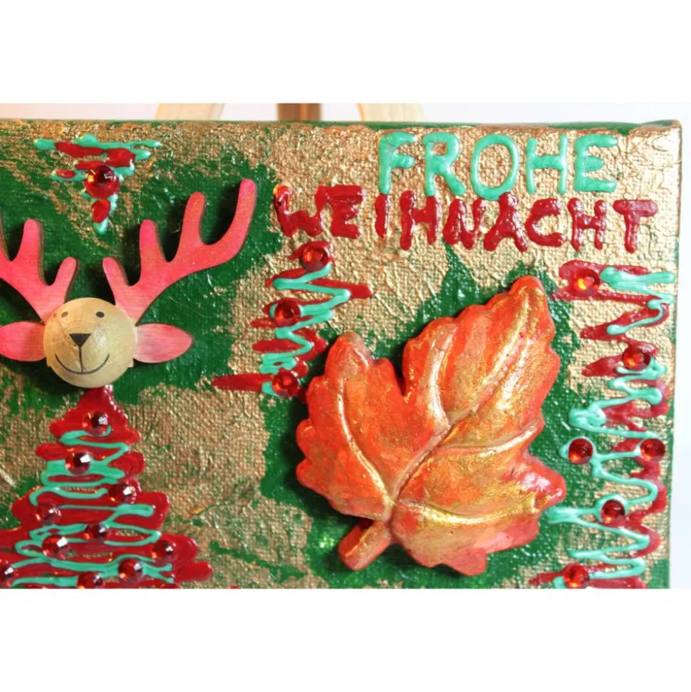 Minibild FROHE WEIHNACHT, kleine Collage Weihnachtsdeko mit Rentierkopf aus Holz, nette Tischdeko oder Gastgeschenk
