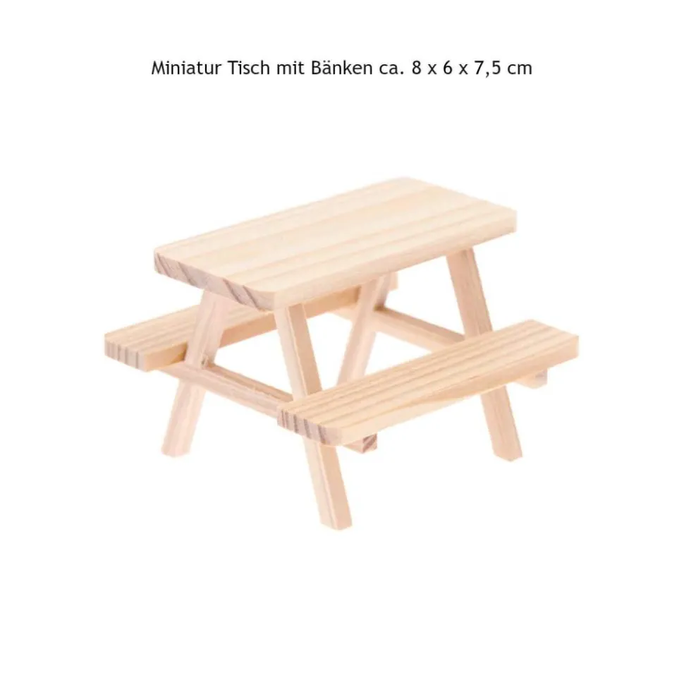 Hergestellt aus Holz, verleiht dieser Miniatur Tisch mit Bänken kreativen Projekten einen Hauch von Natürlichkeit und Eleganz.