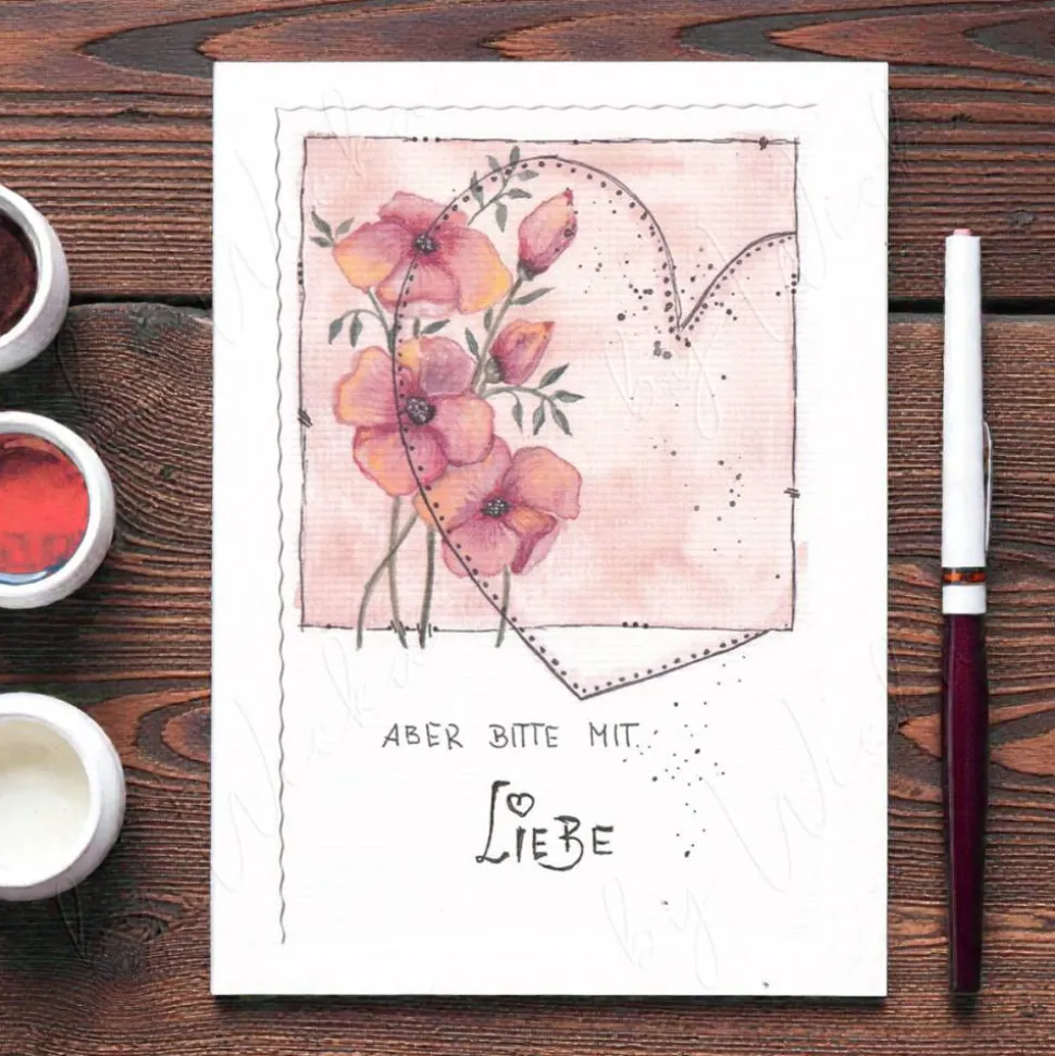Handgemalte Klappkarte „Aber bitte mit Liebe“ Rote Blüten mit Herz