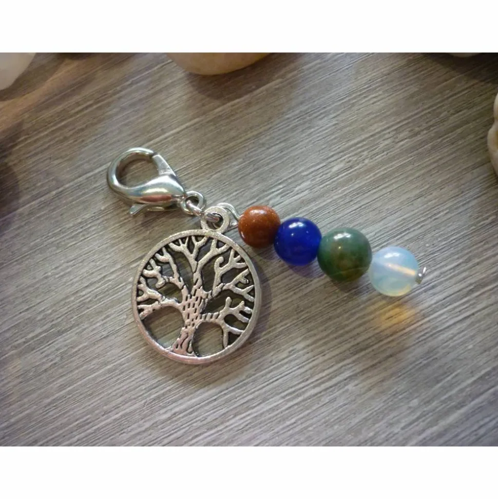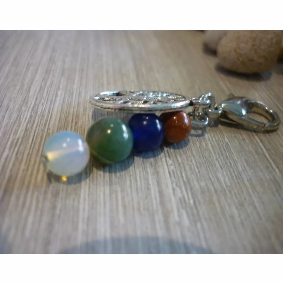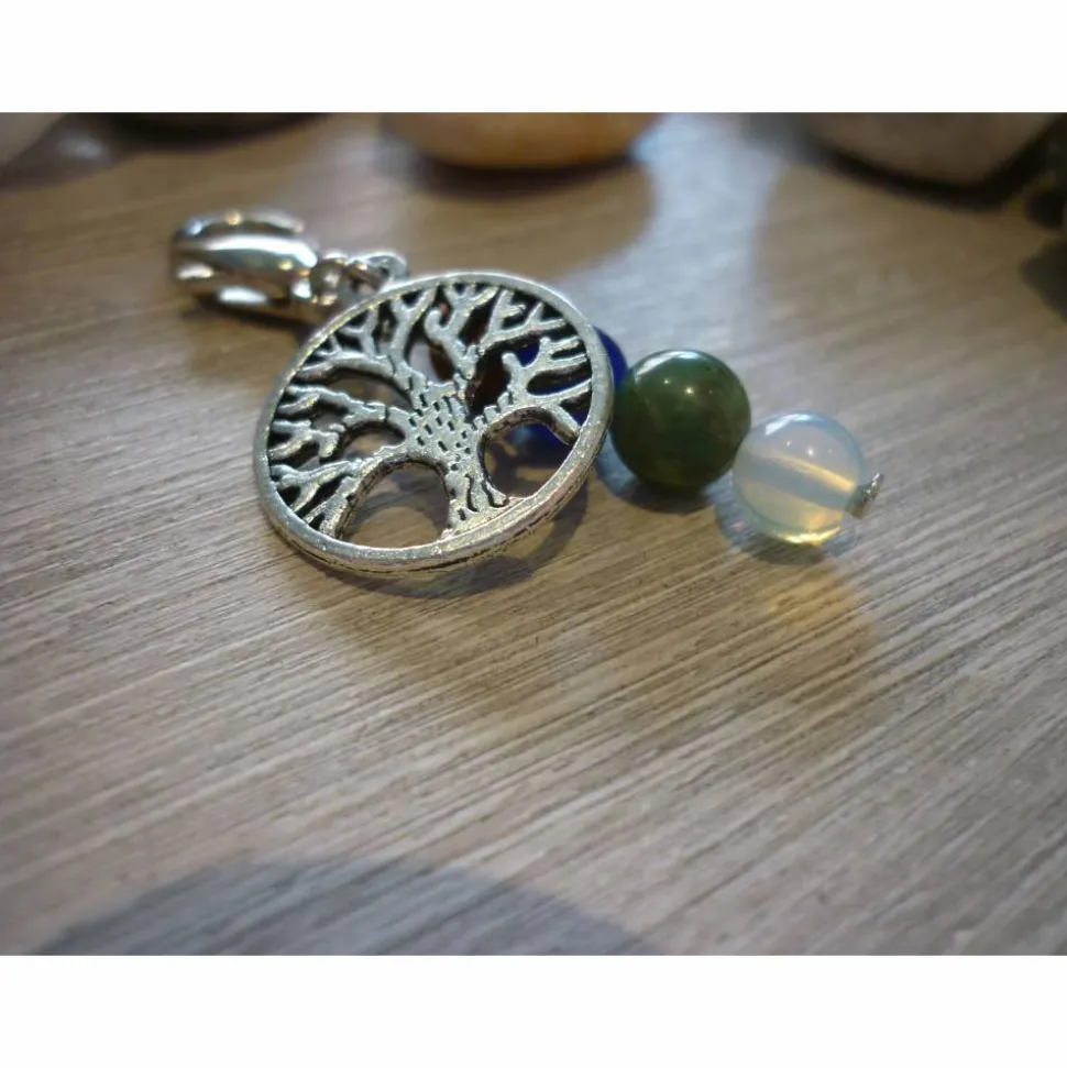 Der Lebensbaum und der Perlenanhänger sind mit einer Metallöse an dem ca 16mm hohem Karabiner befestigt.