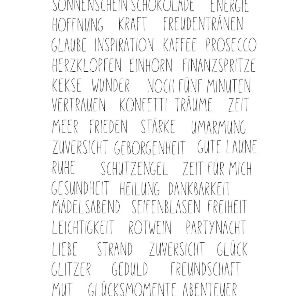 Sonnenschein, Schokolade, Energie, Hoffnung, Kraft, Freudentränen, Glaube, Inspiration, Kaffee, Prosecco, Herzklopfen, Einhorn, Kekse, Wunder, Noch fünf Minuten, Vertrauen, Konfetti, Träume, Zeit, Meer, Frieden, Stärke, Umarmung, Zuversicht, Geborgenheit, Gute Laune, Ruhe, Schutzengel, Zeit für mich, Gesundheit, Heilung, Dankbarkeit, Mädelsabend, Seifenblasen, Freiheit, Leichtigkeit, Rotwein, Partynacht, Liebe, Strand, Zuversicht, Glück, Glitzer, Geduld, Freundschaft, Glücksmomente, Abenteuer