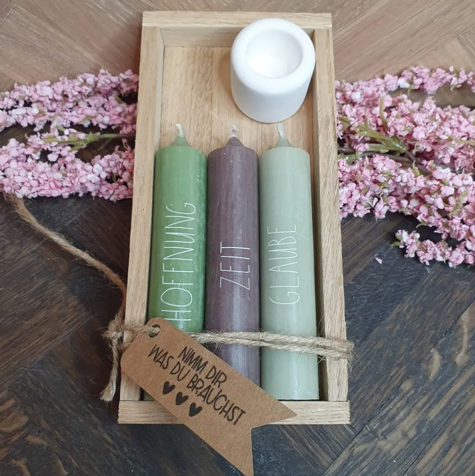 – 3 Kerzen mit Schriftzug (Farbe der Kerzen + die Wörter sind frei auswählbar)