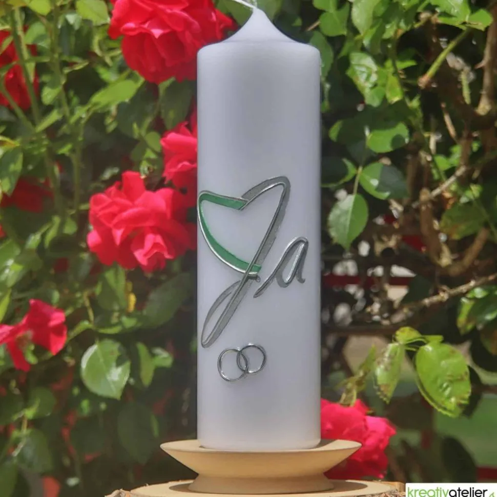 Modern und schlicht von Hand verzierte weiße Hochzeitskerze mit silbernen Wachsverzierungen. Der Schriftzug „Ja“ bildet die Basis für diese Verzierungen. Das sonst zur linken Seite offene „J“ wurde hier durch einen entgegengesetzt verlaufenden Bogen zu einem Herz modelliert. Der eher schlicht wirkende Schriftzug in mattsilber wird durch den farblichen Streifen in einem dunklen Rosa oder einem Grün am linken Herzrand aufgefrischt. Auch der dezent verlaufende Silberstreifen entlang des Schriftzugs verleiht der Hochzeitskerze etwas Edles.