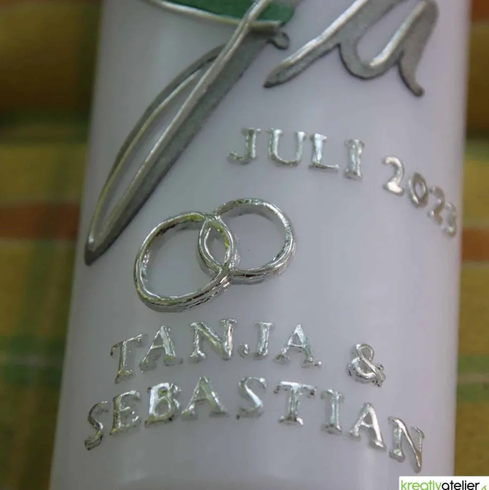 Unterhalb des Schriftzuges rechts von den stehenden Ringen aus Wachs ist Platz für die Namen der Brautleute und für das Hochzeitsdatum. Für die Beschriftung verwende ich ausschließlich Wachs.
