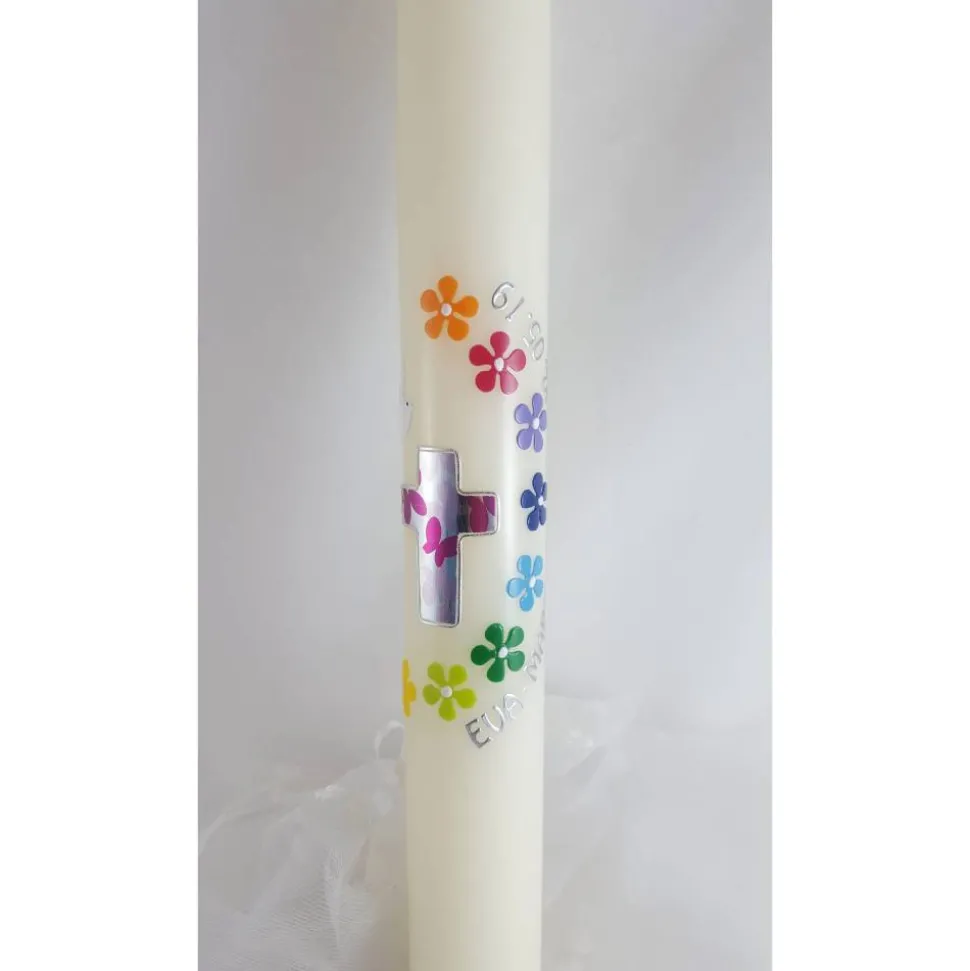– die Blumen in den Farben des Regenbogens säumen das Kreuz dieser Kommunionkerze