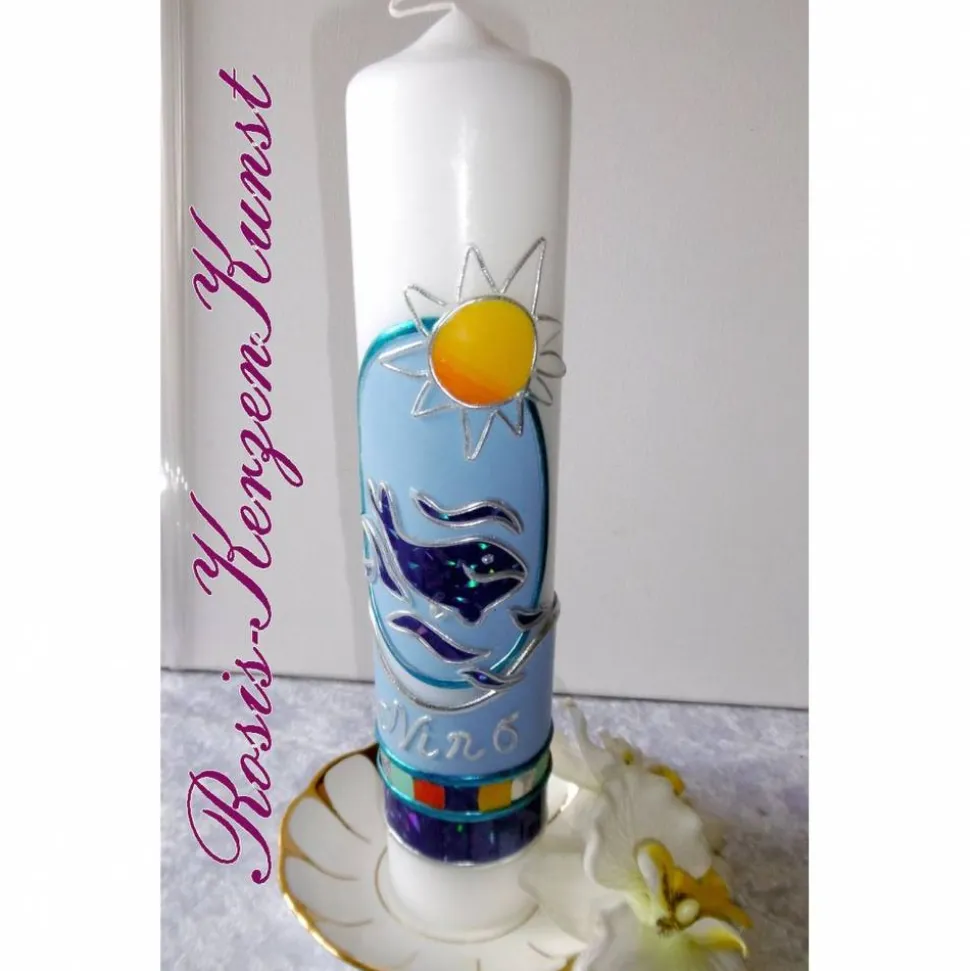 Unsere von Hand gestaltete Kerze zeigt als Hauptmotiv ein modern gestaltetes “ ICHTHXS-Symbol“. Das Motiv ist vorwiegend in verschiedenen Blautönen gehalten, wobei das gelb der Sonne einen schönen farblichen Kontrast setzt. Dennoch wirkt die Kerze dezent und farblich harmonisch und eignet sich besonders gut für einen Buben aber auch für ein Mädel.