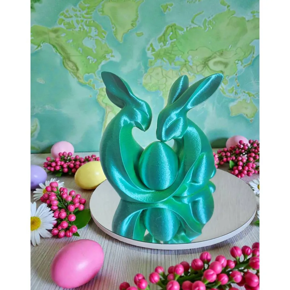 Schenke deinem Zuhause eine Prise moderne Frühlingsgefühle! Diese kunstvoll gestaltete Hasenfigur zeigt zwei Hasen, die sich schützend um ein Ei schmiegen. Ein Symbol für Verbundenheit, Liebe und den Neubeginn des Frühlings.