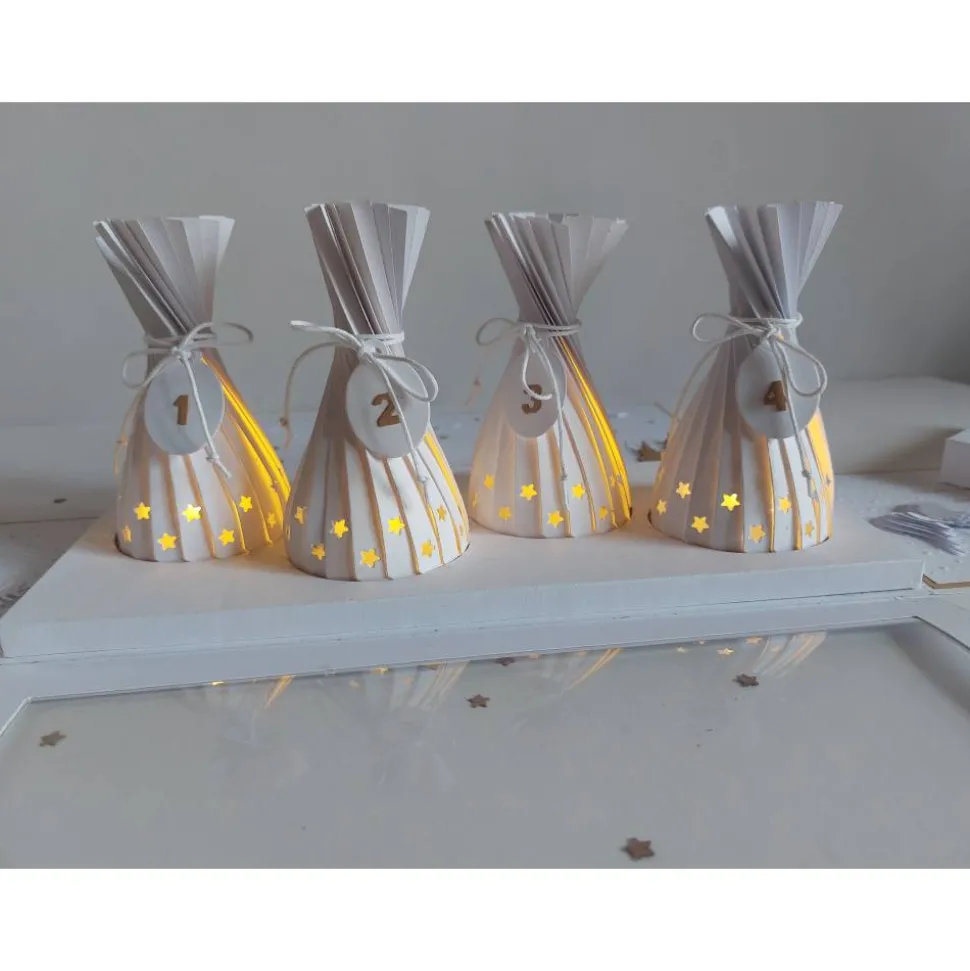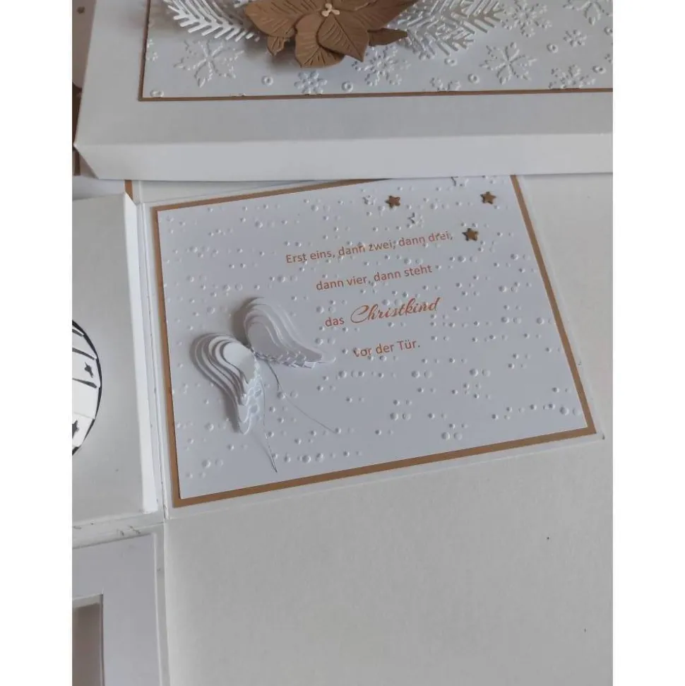 Jeder Lampion trägt eine Kordel mit Anhänger, auf denen die Adventswochen angebracht sind. Im Inneren der Box findest du auf der breiten Fläche die filigranen Umrisse eines Winterdorfes. Die seitlichen Wände sind mit einem schönem Spruch, einem Engel und Flügeln liebevoll verziert.