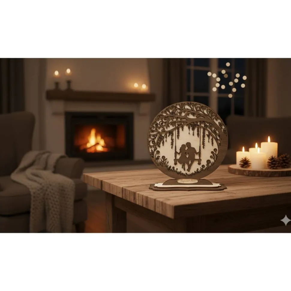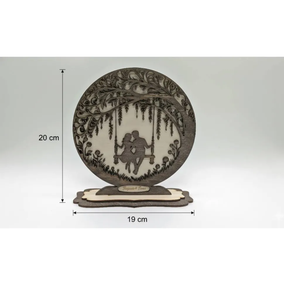 - Zweischicht-Design: Die vordere Ebene mit Baum und Paar ist dunkel lasiert, der helle Hintergrund sorgt für sanften Kontrast und Tiefe.