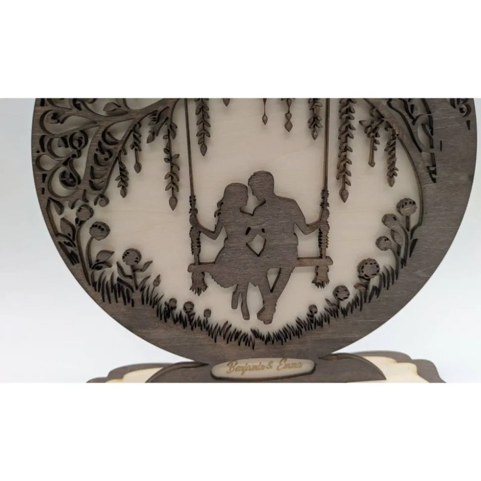 Ein Augenblick für die Ewigkeit: Mit dem kunstvollen 3D-Schattenbild „Moment im Glück“ verleihst du deiner Liebe auf besondere Weise Ausdruck. Die detailreiche Szene zeigt ein Paar auf einer Schaukel, geschützt von einem filigranen Blätterdach – ein Symbol für Verbundenheit und Romantik.