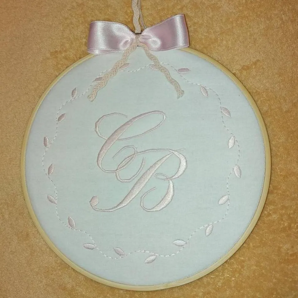 Deses Stickbild ist ganz dezent mit einem Monogramm bestickt. Verziert mit einer Schleife und einem Band zum Aufhängen.