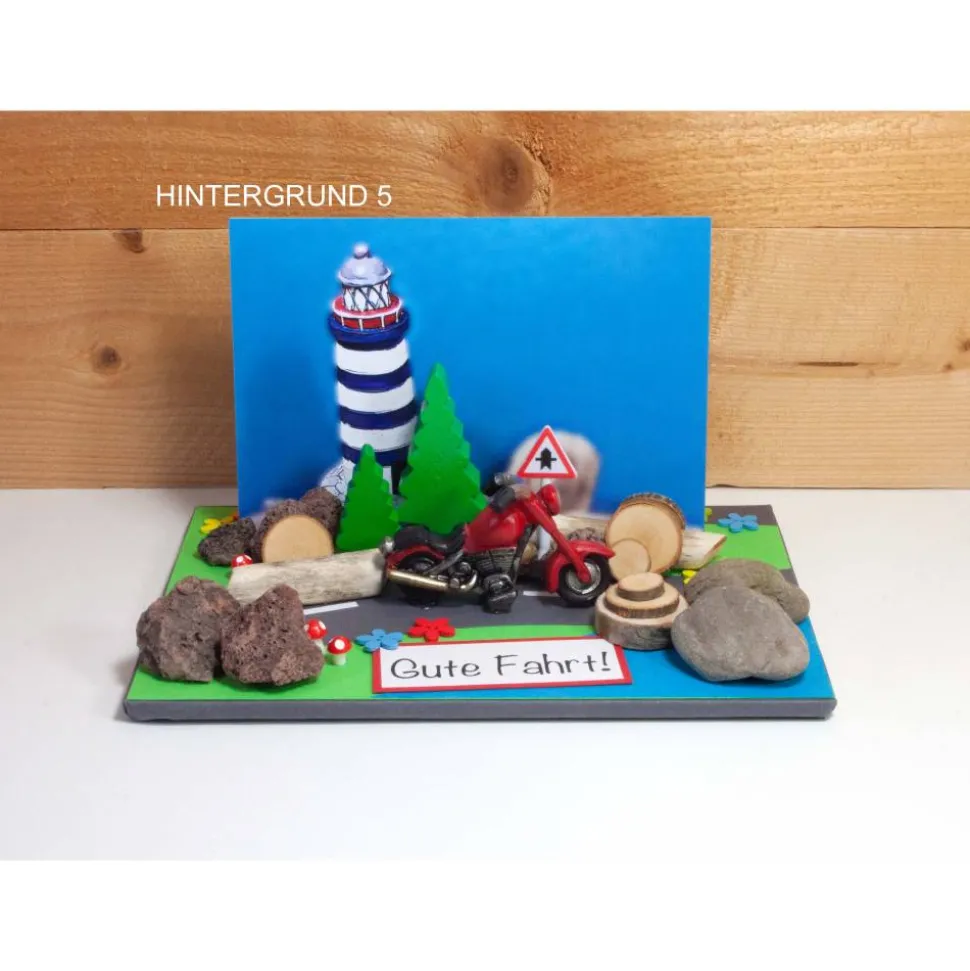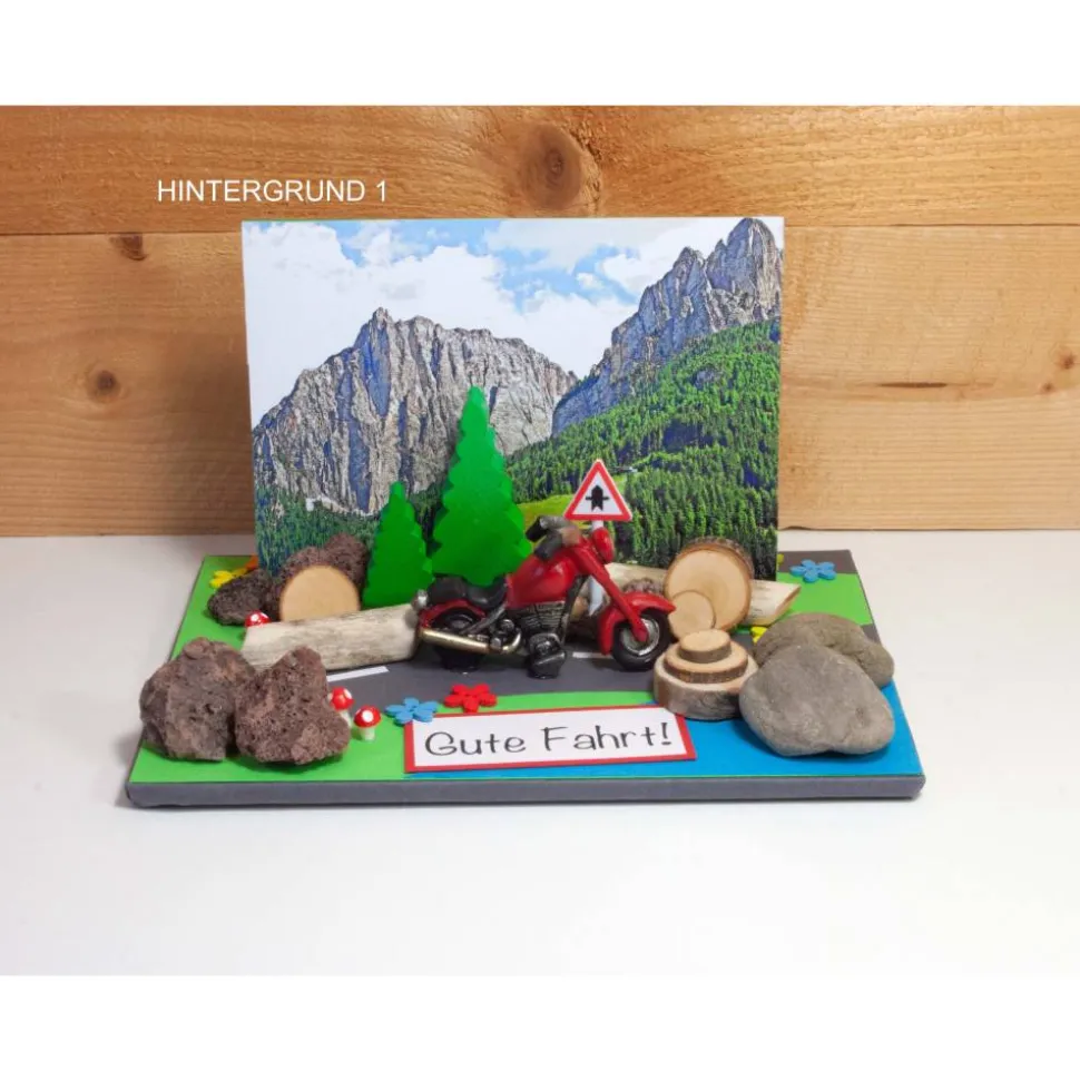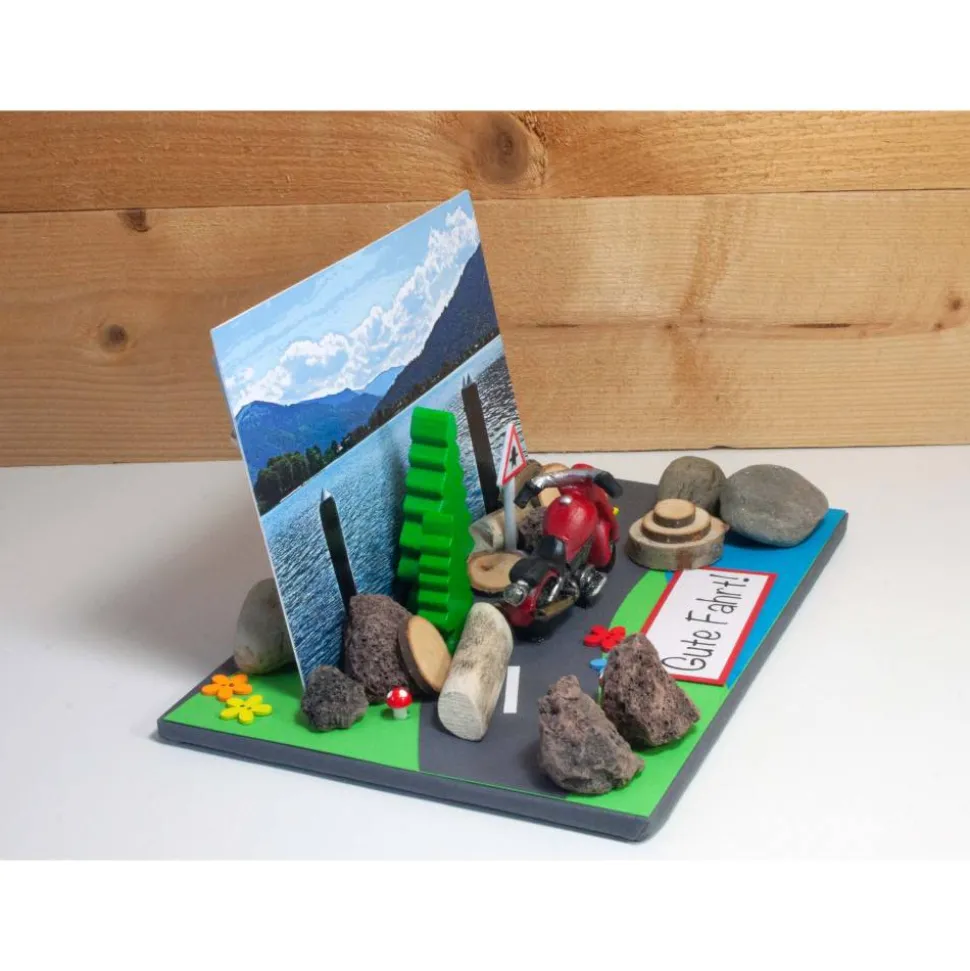 Geschäumte Pappe, Fotokarton, Motorrad Polyresin, Umschlag + Karte, Lavasteine, Steine, Streublümchen, Treibholz, Pilze Kunststoff, Baum Holz, Kork, Verkehrsschild Kunststoff und Metall.