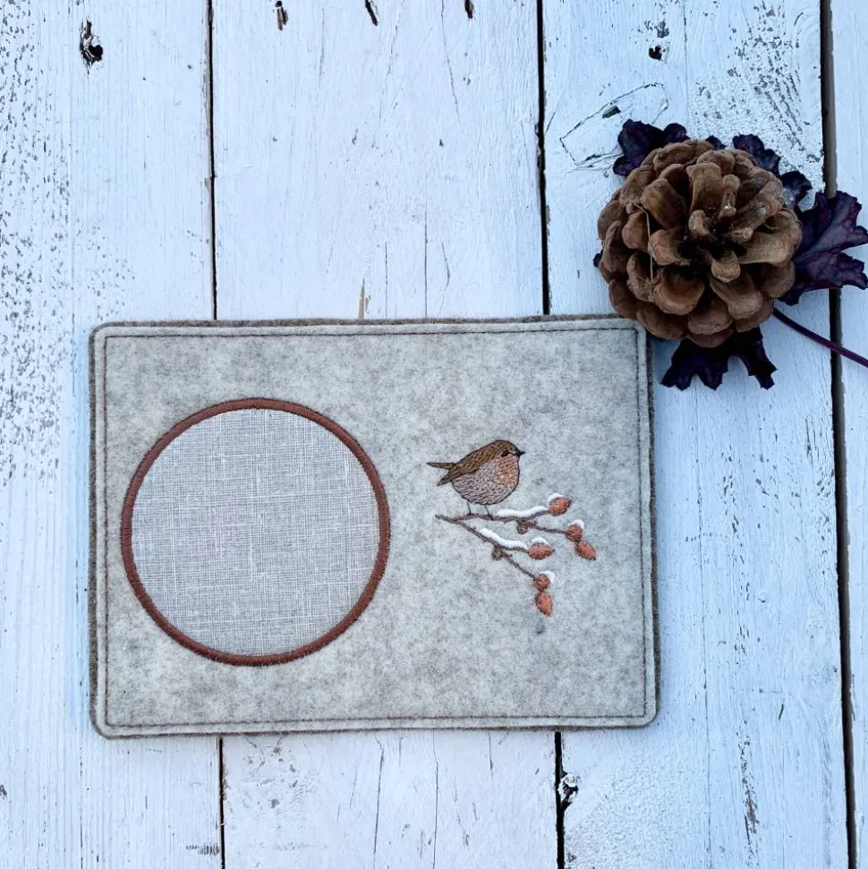 Aus hochwertigem Wollfilz gefertigt, bestickt mit einem Rotkehlchen auf Hagebuttenzweigen.