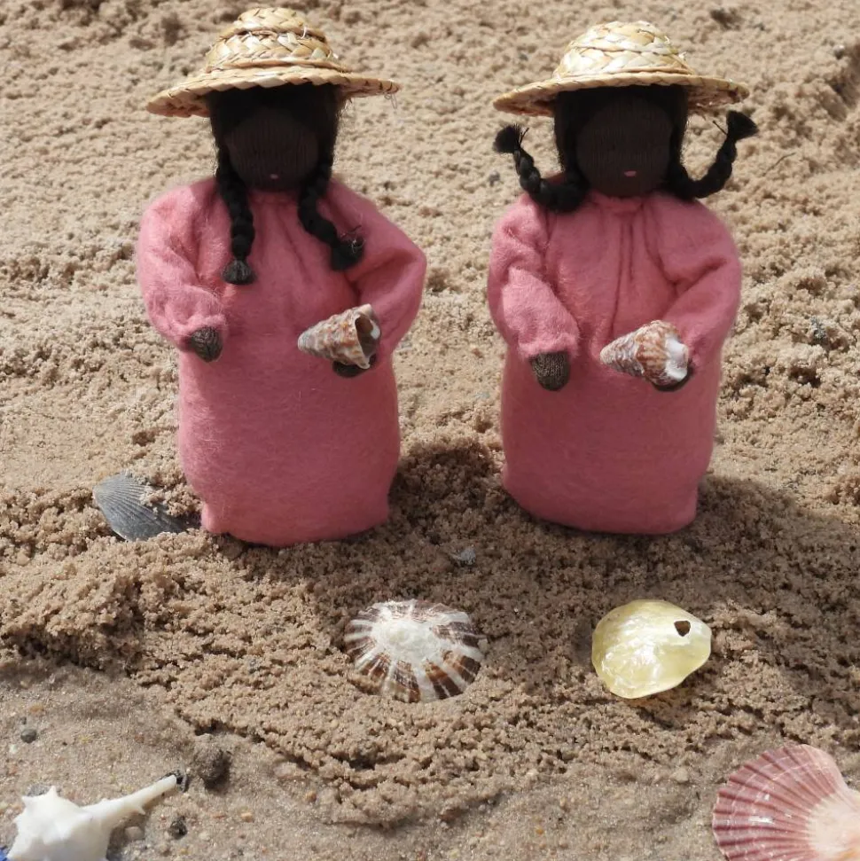 Die Kinder sind ca. 10 cm groß und mit süddeutscher Merinowolle ausgestopft.