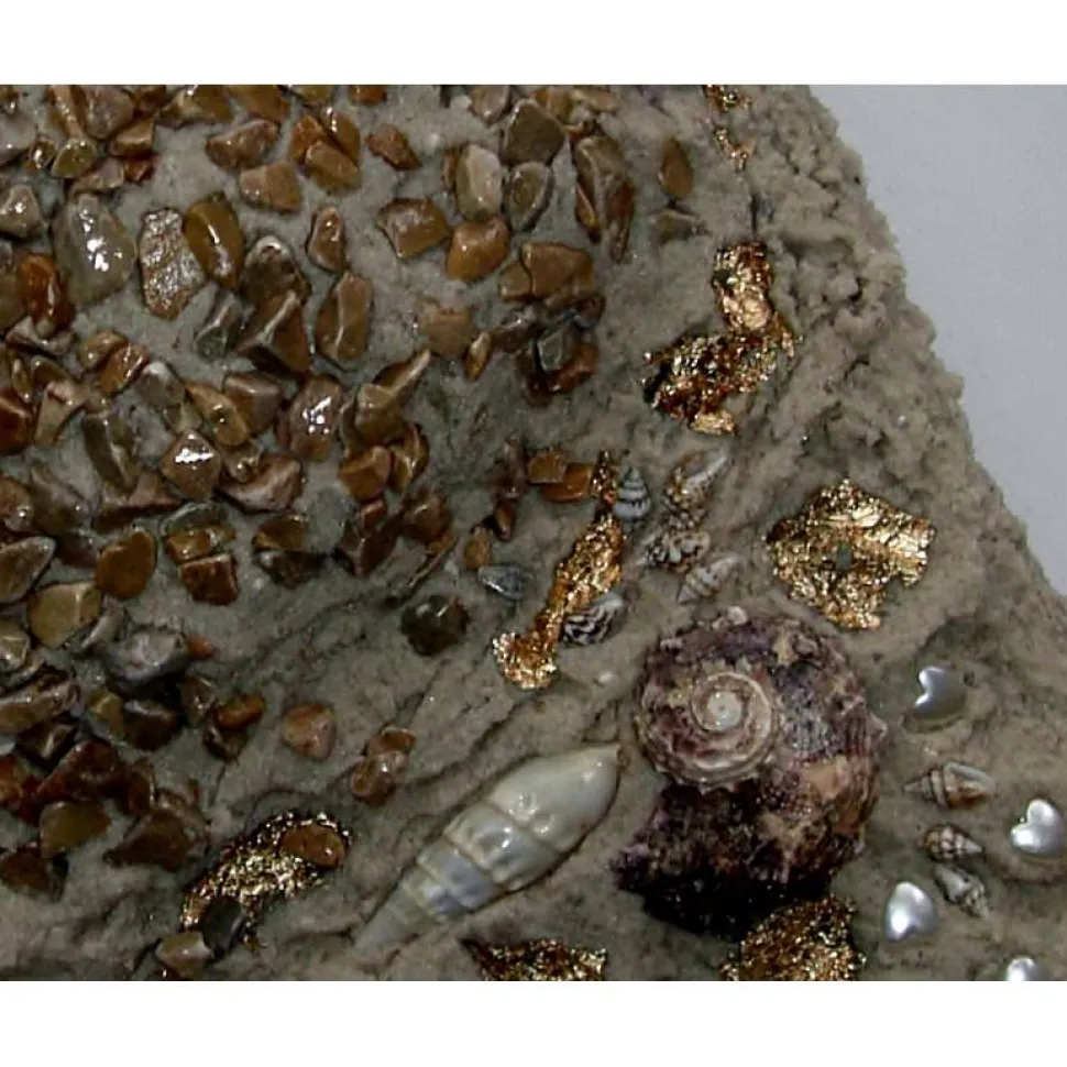Sand, Blattmetall, Muscheln, Steine, Perlen in Herzform und vieles mehr, liebevoll auf einem dreieckigen Keilrahmen gestaltet.