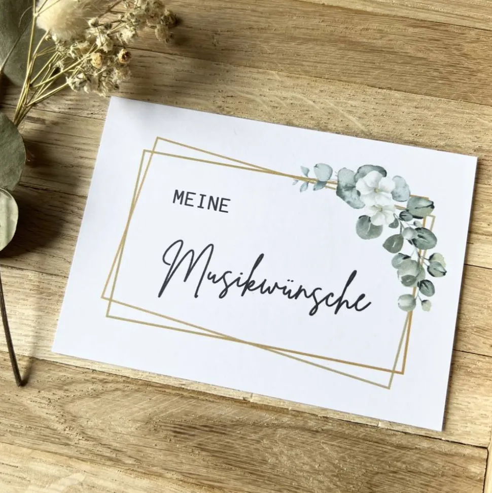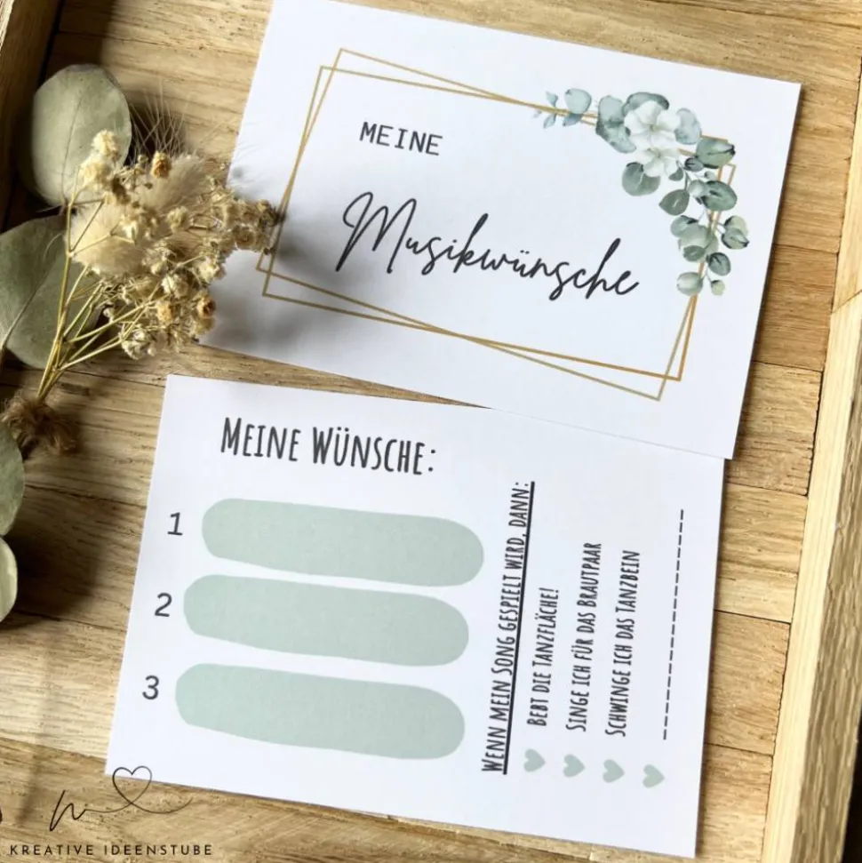 Lasst eure Hochzeitsgäste ein wenig bei der Musikauswahl mitbestimmen. Mit diesen Karten können sich eure Gäste Songs wünschen, wo wird der Abend sicher abwechslungsreich & mit Sicherheit nicht langweilig.