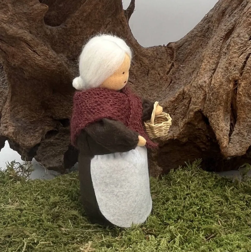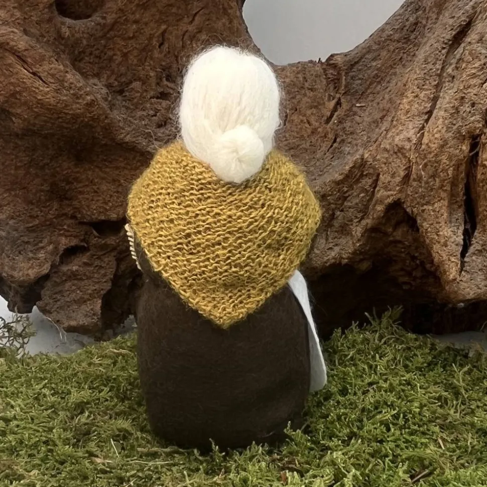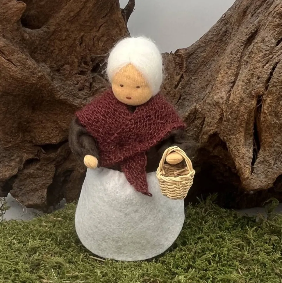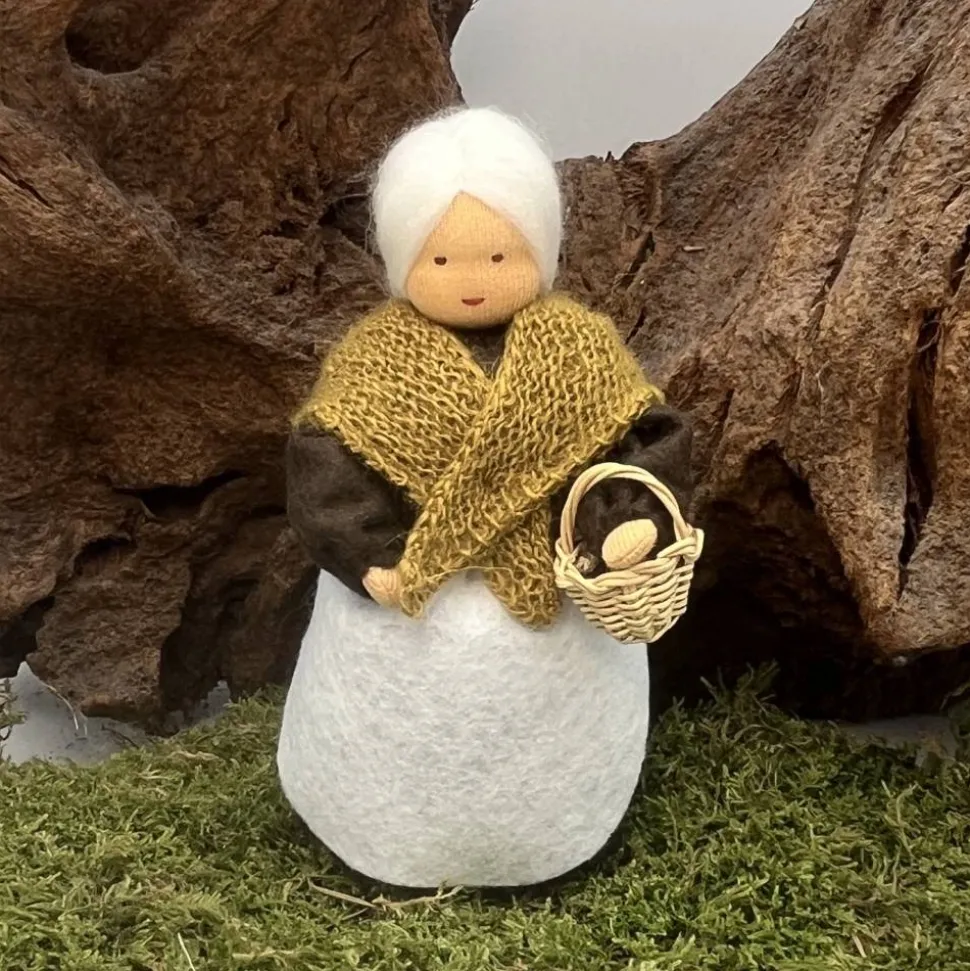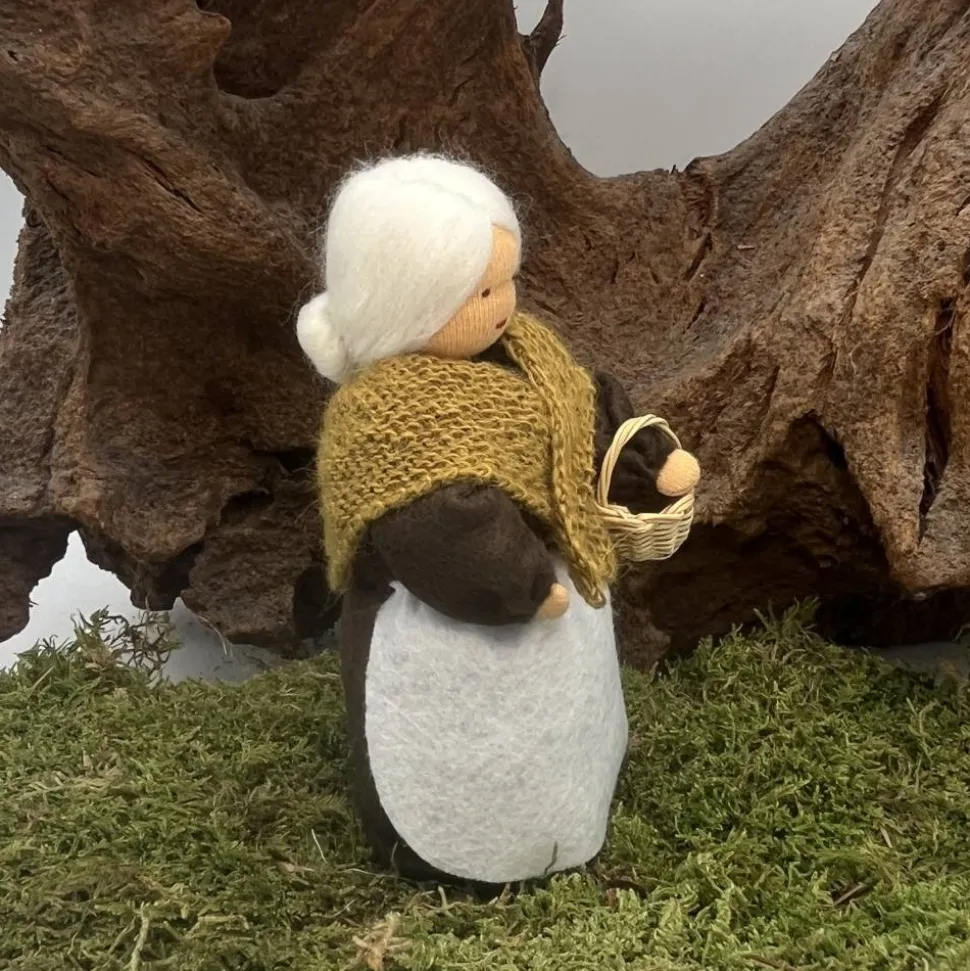 Das Püppchen ist unten geschlossen und für einen guten Stand unten mit feinem Dekokies und der Rest mit reiner Schurwolle gefüllt.