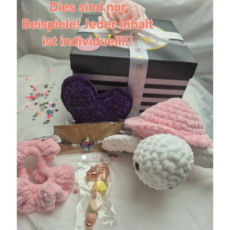 In dieser Box findest du mehrere handgemachte Schätze aus meinem Sortiment – sorgfältig gehäkelt, individuell ausgewählt und hübsch verpackt.