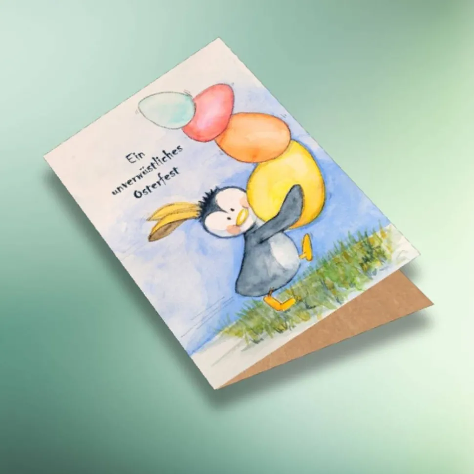 Entdecke die nachhaltige Osterkarte „Ein unverwüstliches Osterfest“! Diese farbenfrohe Aquarellkarte begeistert mit einem lustigen Pinguin und bringt Humor in dein Osterfest. Ob als Klappkarte mit Umschlag oder als Postkarte, das handgemalte Motiv sorgt für echte Freude im Osternest. Versende originelle Ostergrüße an Familie und Freunde und verschenke ein kleines Stück handgemalter Kunst.