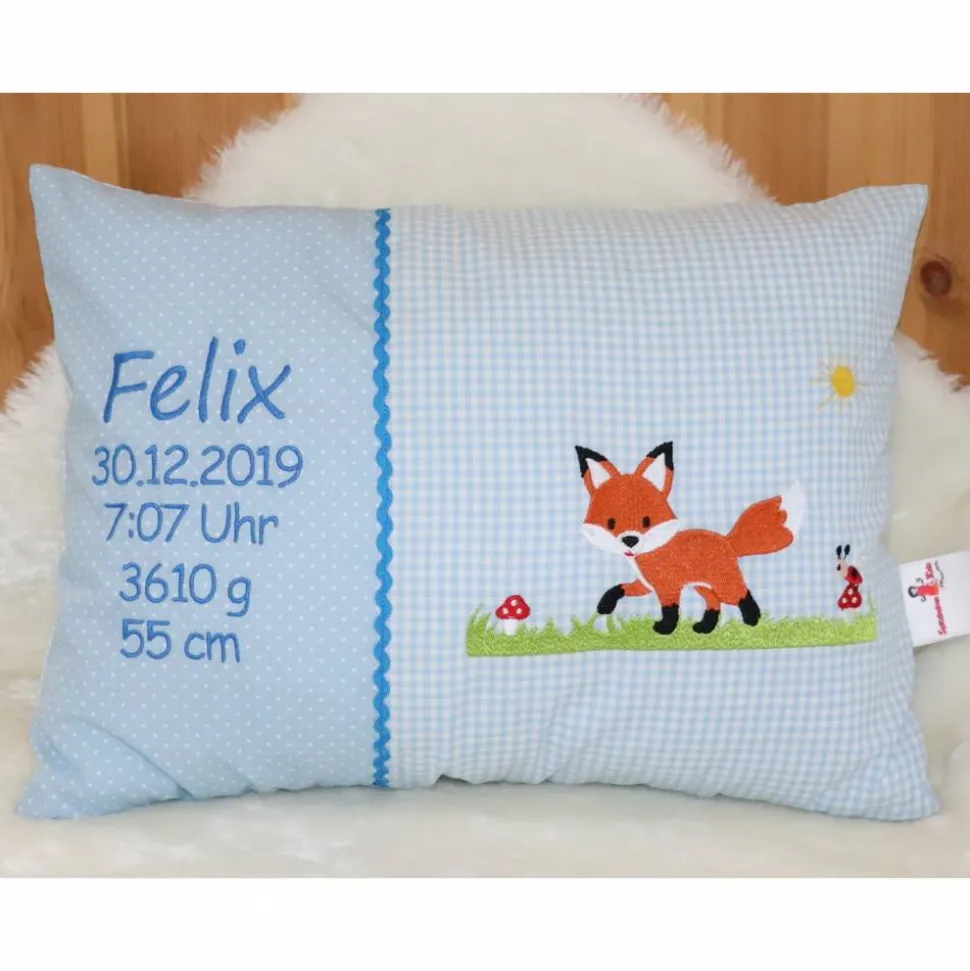 Süßes Geburtskissen mit einem Stickbild wählbar und den Geburtsdaten des Kindes. Kissen besteht aus Hülle & Inlett.