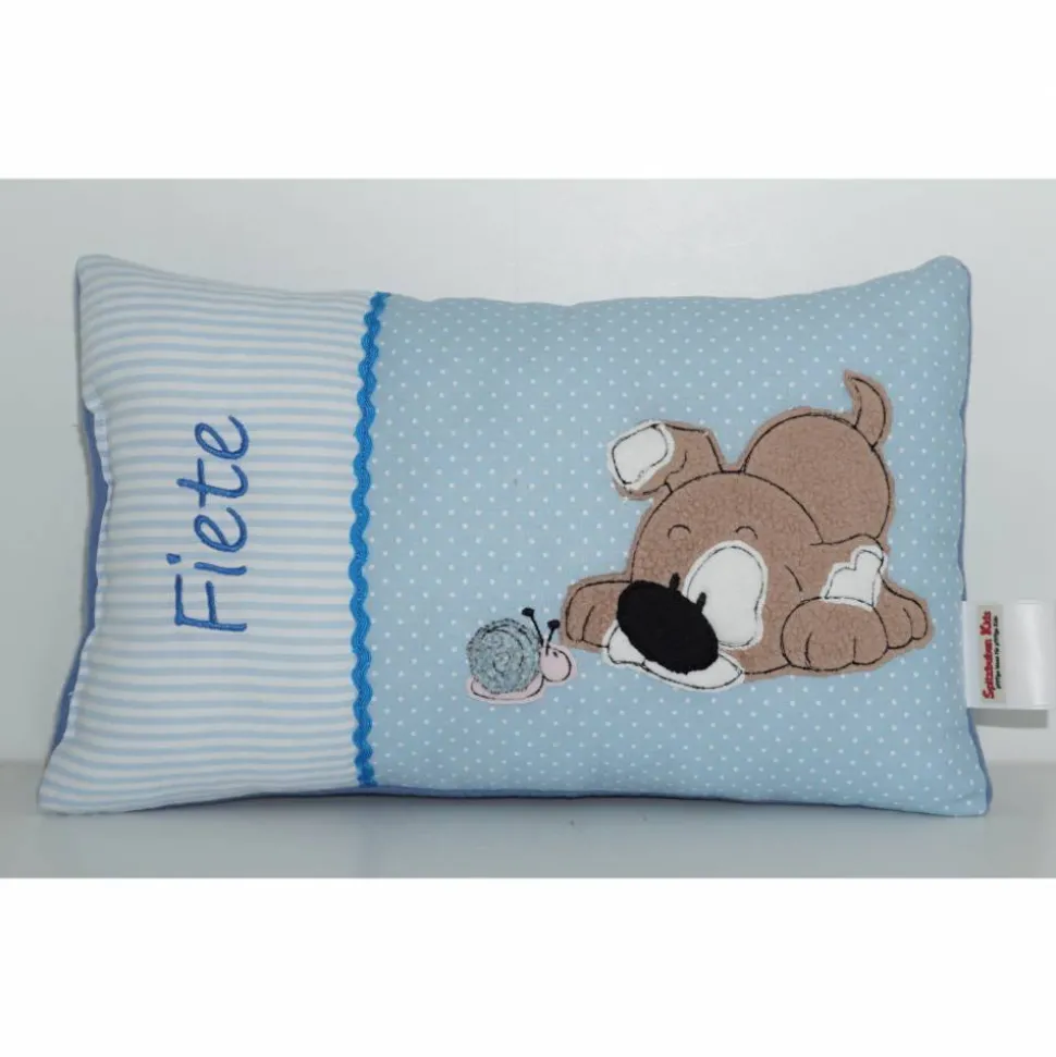 Süßes Kuschelkissen mit der Doodle Stickerei Hund und Schnecke und Namen des Kindes. Seitlich Stoff Streifen.