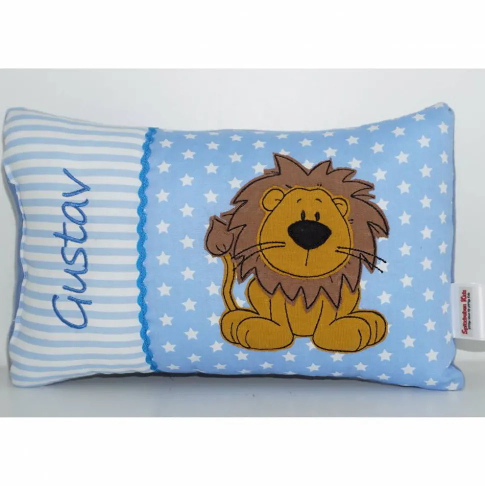Süßes Kuschelkissen mit der Doodle Stickerei Löwe Lars und Namen des Kindes. Seitlich Stoff Streifen.