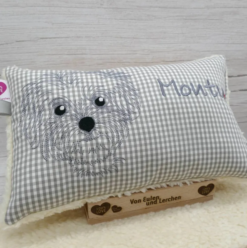Aufwendig und mit viel Liebe zum Detail genähtes und gesticktes Mini-Kissen